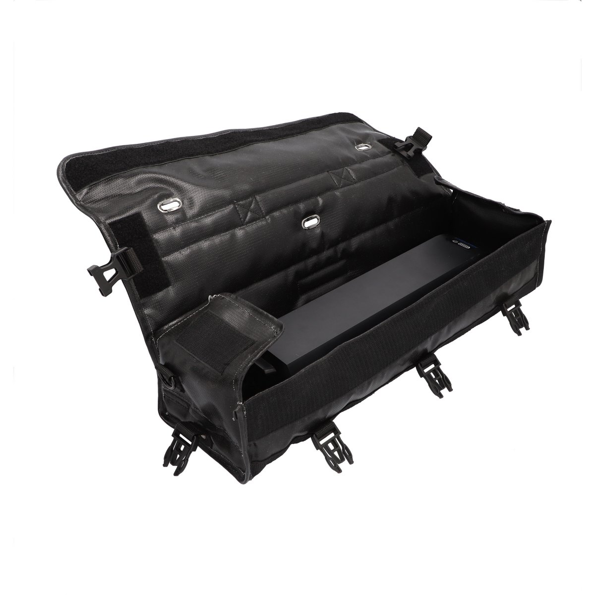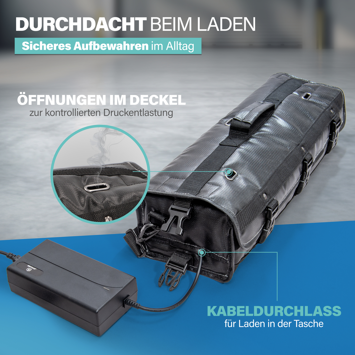 Für sicheren Halt sorgen breite Klettverschlüsse, robuste Metallschnallen und eine zusätzliche Nietenverstärkung. Diese Kombination gewährleistet Stabilität und verhindert ein ungewolltes Öffnen der Tasche. Ein besonderes Sicherheitsmerkmal sind die Öffnungen im Deckel, durch die Rauchgase kontrolliert entweichen können. So wird Überdruck reduziert und das Risiko eines Aufblähens oder Platzens minimiert.