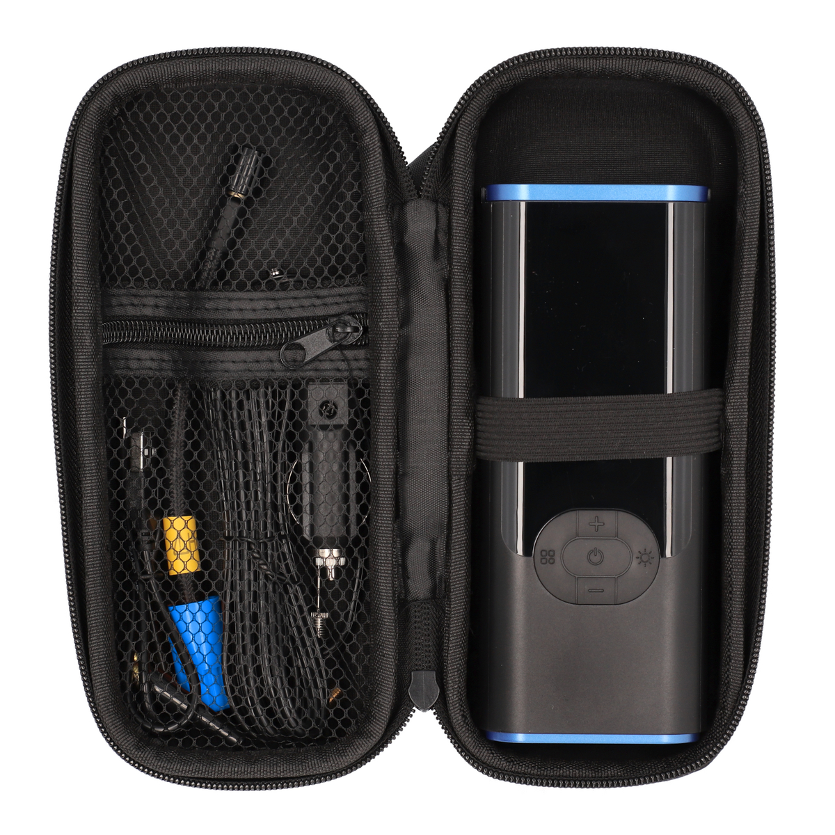 Mit Schlauch und vier Aufsätzen bist du flexibel für unterschiedliche Ventile und Anwendungen. Die mitgelieferte Aufbewahrungstasche hält alle Teile ordentlich zusammen und schützt den Kompressor zuverlässig beim Transport.