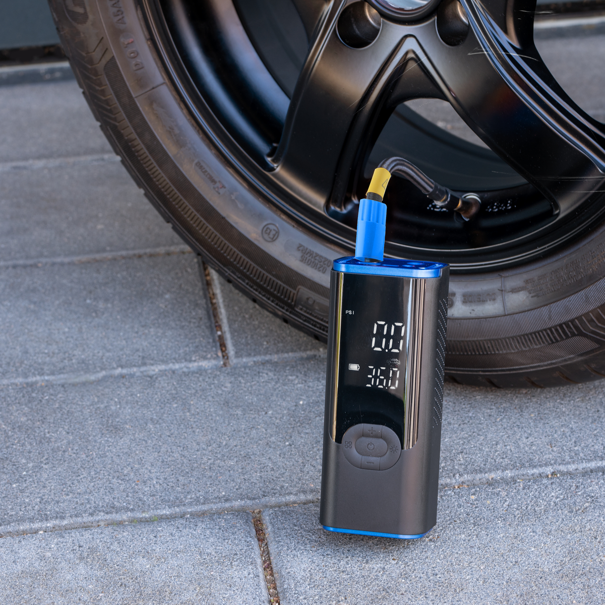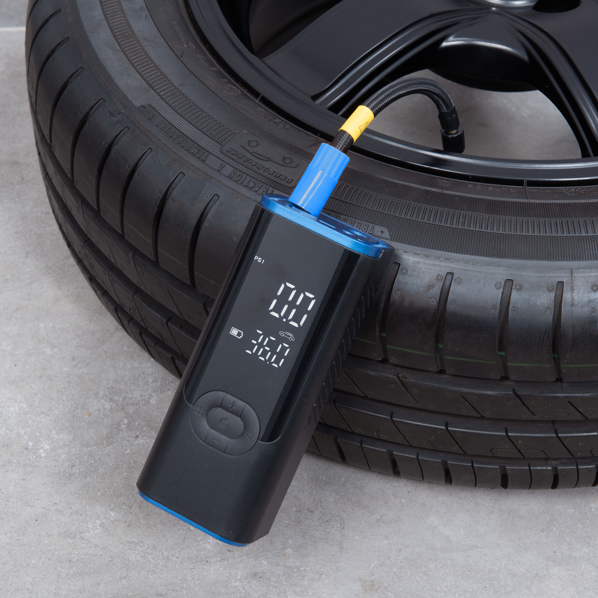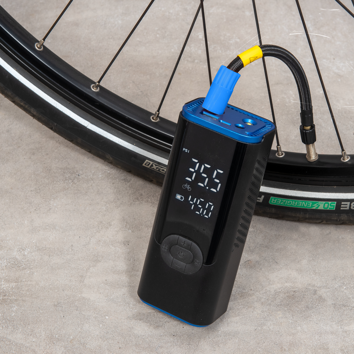 Dank einer Luftleistung von 19 l/min und 80 W Leistung pumpt das Gerät spürbar schneller als viele vergleichbare Modelle. Du stellst den gewünschten Zielwert bequem in PSI oder BAR ein, der Kompressor pumpt vollautomatisch bis zum Sollwert und stoppt selbstständig. So vermeidest du Überpumpen und sparst Zeit. Das beleuchtete Dual Display zeigt gleichzeitig den aktuellen Reifendruck und den eingestellten Zielwert an. Eine integrierte Batterieanzeige informiert jederzeit über den Akkustand.