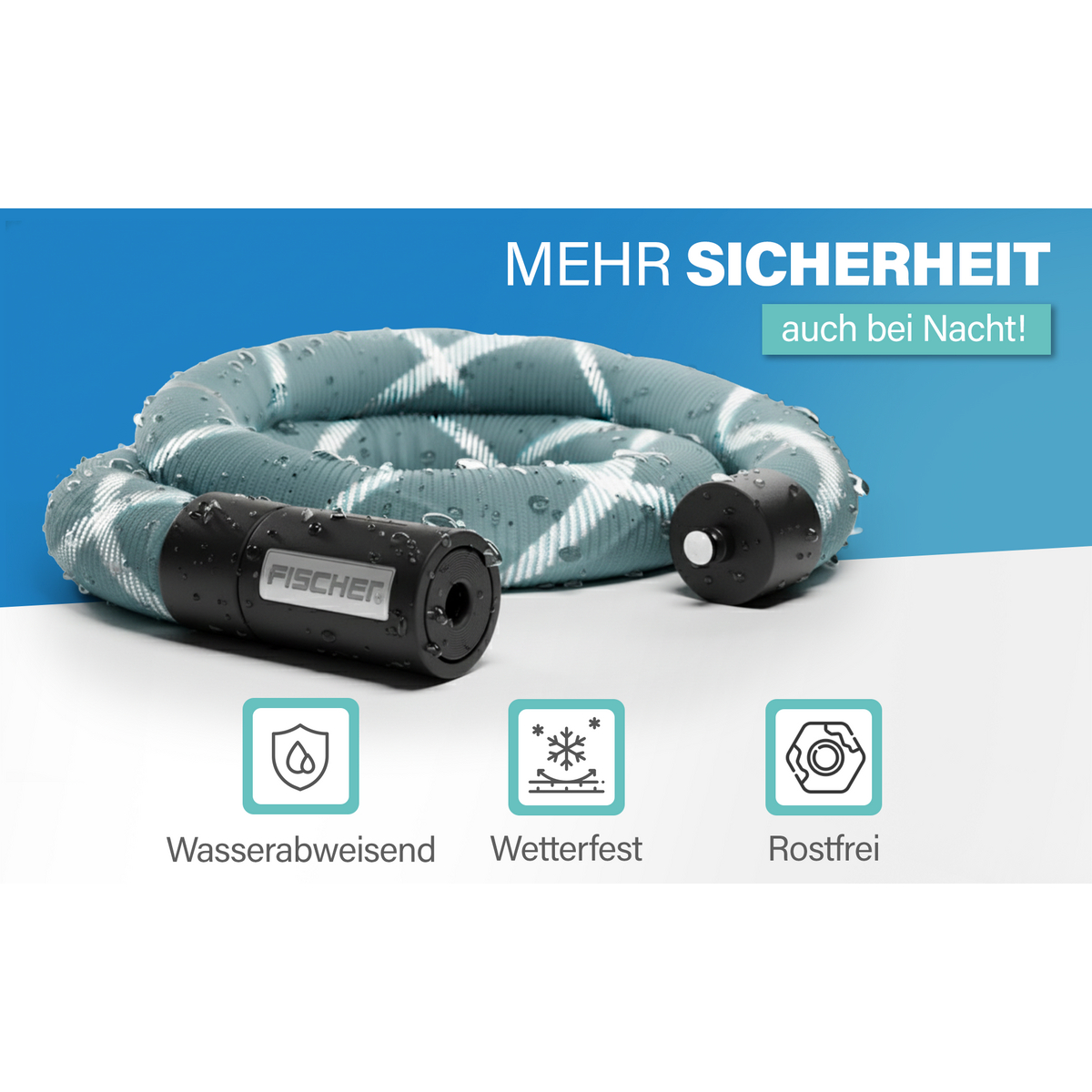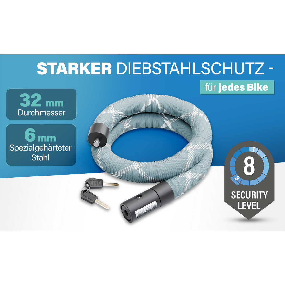 In die Ummantelung integrierte Reflexfäden erhöhen die Sichtbarkeit bei Dunkelheit. Das verbessert die Sicherheit im Straßenverkehr, insbesondere beim Abstellen am Straßenrand oder in schlecht beleuchteten Bereichen. Das Schloss wird mit zwei Hochsicherheits-Schlüsseln geliefert, sodass jederzeit ein Ersatz griffbereit ist.