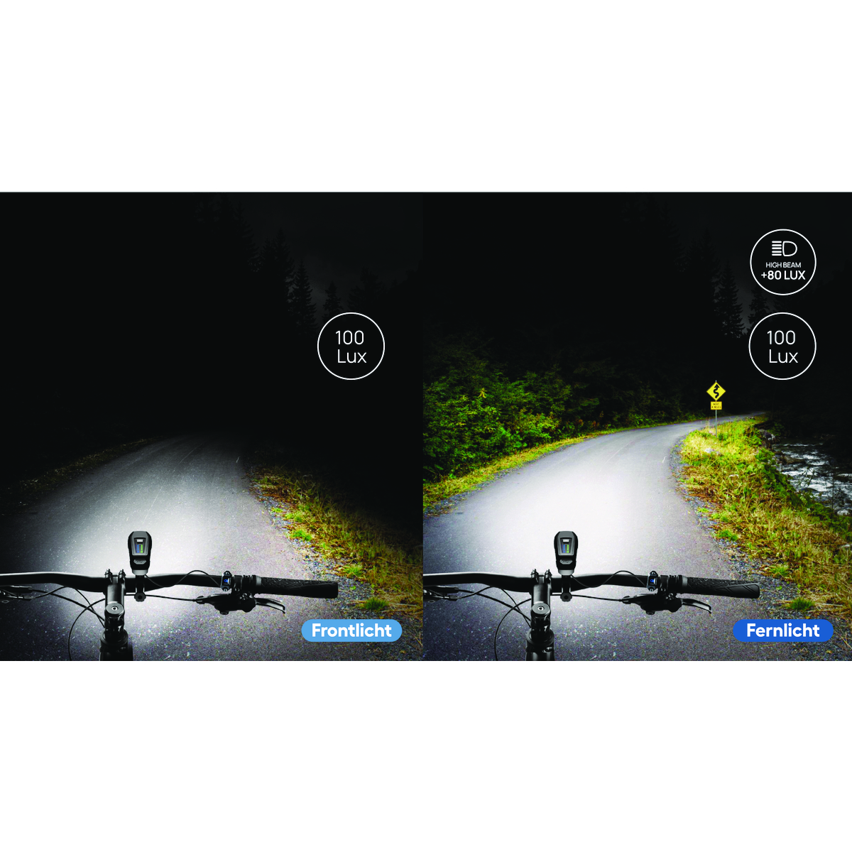Die Frontleuchte bietet vier Helligkeitsstufen (25, 50, 75, 100 Lux) sowie einen intelligenten Sensormodus, der die Leuchtstärke automatisch anpasst. Mit der Levelling-Funktion lässt sich der Lichtkegel präzise einstellen, sodass Sie optimal sehen, ohne andere Verkehrsteilnehmer zu blenden. Im Fernlicht-Modus erreicht die Leuchte sogar 180 Lux Gesamthelligkeit.