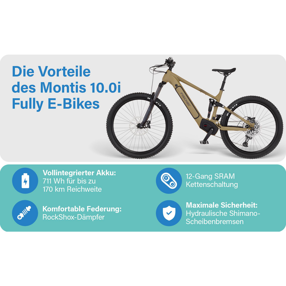 Das Montis 10.0i Fully kombiniert kraftvolle Performance mit maximalem Fahrspaß – perfekt für anspruchsvolle Touren im Gelände. Der starke BROSE Mittelmotor mit satten 90 Nm Drehmoment bietet in verschiedenen Modi eine dynamische Unterstützung und lässt sich intuitiv über die Lenker-Bedieneinheit steuern. Die hydraulische 4-Kolben SHIMANO Scheibenbremse sorgt für zuverlässige Bremsleistung, auch bei höheren Geschwindigkeiten und steileren Abfahrten. Mit seinem besonders großen, vollintegrierten Akku bietet das Bike eine beeindruckende Reichweite von bis zu 170km. Der Akku kann seitlich entnommen und sowohl separat als auch direkt am Bike geladen werden. Dank der 12-Gang SRAM Kettenschaltung schaltest du schnell und präzise – ideal für sportliche Fahrten auf unterschiedlichem Terrain. Höchsten Komfort garantiert die vollgefederte Bauweise mit der Rockshox Luftfedergabel, die auch gröbere Unebenheiten spielend ausgleicht. Die manuell absenkbare Sattelstütze ermöglicht eine schnelle Anpassung der Sitzhöhe während der Fahrt – für optimale Kontrolle in jedem Gelände. Optisch überzeugt das Bike mit seinem zeitlosen Design in Olive matt, das Kraft und Eleganz perfekt vereint.