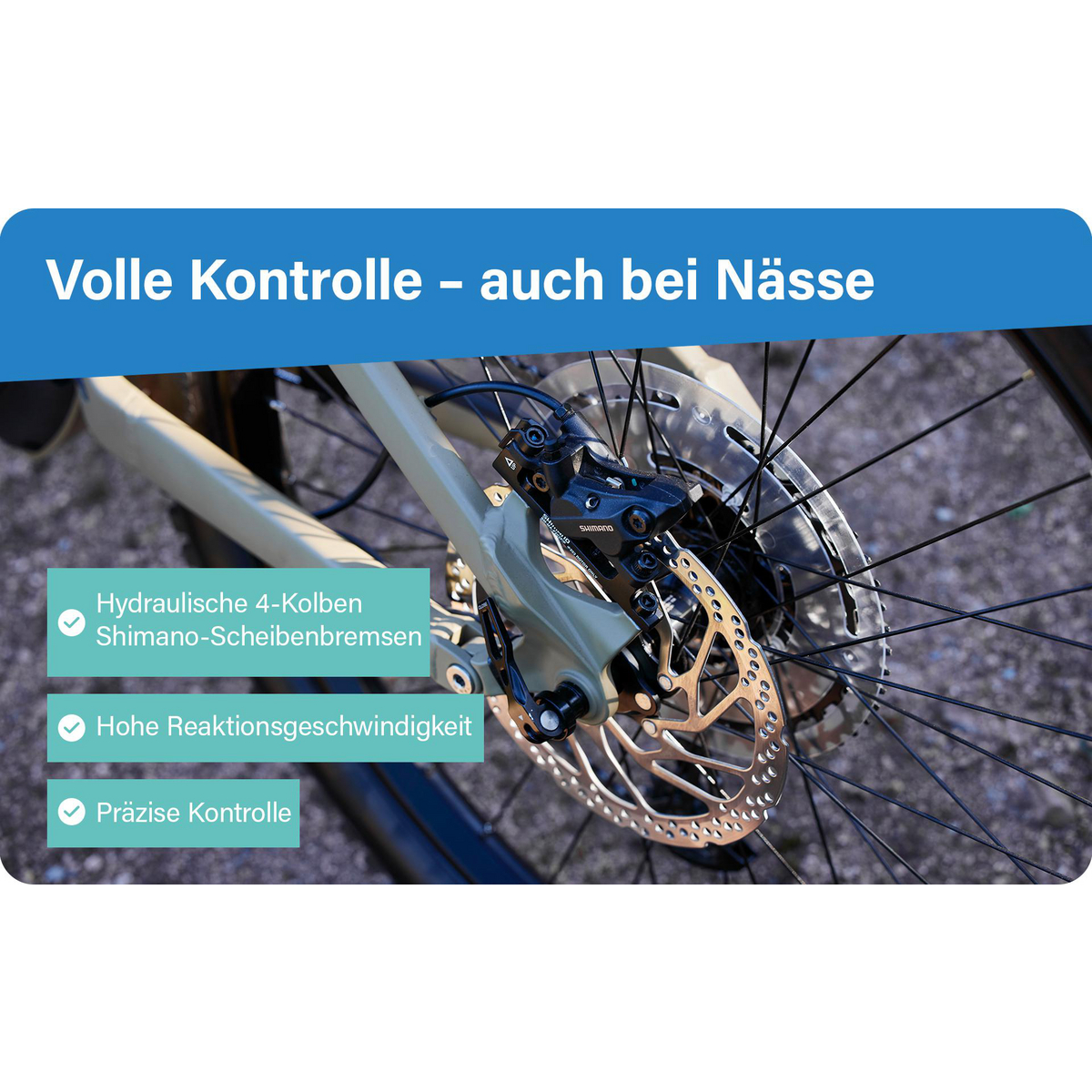 Maximale Bremskraft – Die hydraulischen 4-Kolben SHIMANO Scheibenbremsen bieten zuverlässige Kontrolle, auch bei hohen Geschwindigkeiten.