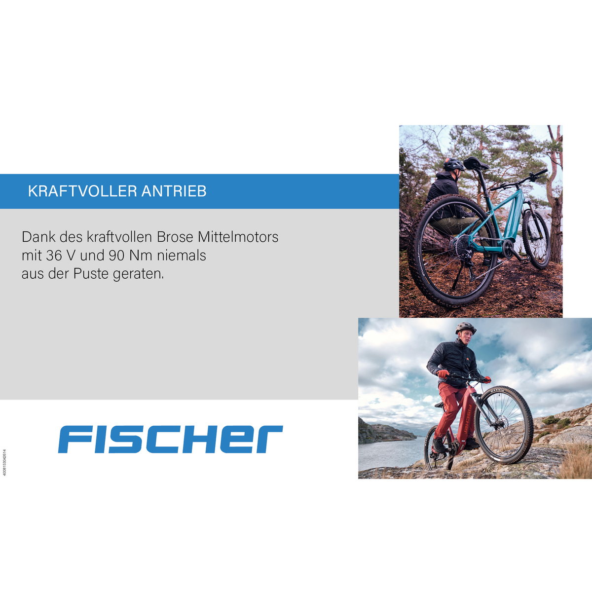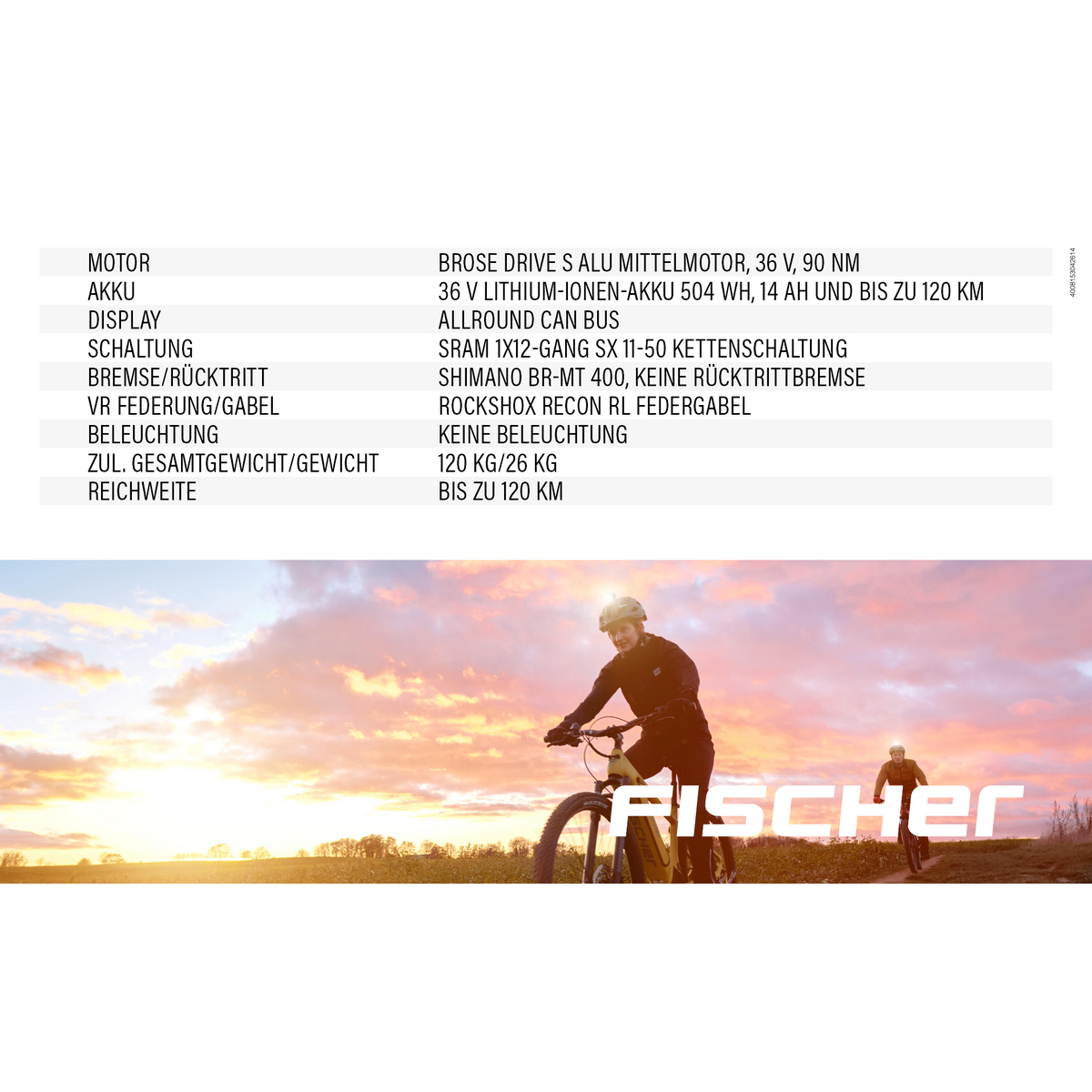 Das FISCHER MONTIS 6.0i Fully ist mit seinen hydraulischen Scheibenbremsen, der besonders stabilen Sattelstütze von Humpert ergotec und dem angenehm sportlichen Ergon Sattel die perfekte Wahl für deine abenteuerlichen Profi-Trailrides. Mit nur 26 kg kg Gewicht und einer Belastbarkeit von bis zu 120 kg ist es robust und dennoch leicht zu transportieren. Die besonders hochwertige RockShox RECON RL Federgabel und die sehr präzise SRAM 1x12-Gang SX 11-50 Kettenschaltung garantieren eine sportliche und schnelle Fahrt. Der leistungsstarke und lang anhaltende 36 V, 504 Wh Lithium-Ionen-Akku bietet dir bis zu 120 km* Reichweite und ist durch die vollintegrierte Bauweise unsichtbar im Rahmen versteckt, gut geschützt und trotzdem einfach entnehm- und aufladbar. Zusätzlich bietet dir FISCHER eine 24-monatige Garantie auf alle vollintegrierten Pedelec Akkus. Mit Hilfe des großen Brose Allround CAN Bus Displays kannst du die Unterstützung des besonders kraftvollen Brose Drive S ALU Mittelmotors mit 90Nm Drehmoment sehr leicht selbst steuern und erhältst alle wichtigen Informationen auf einen Blick - Fahrspaß garantiert.