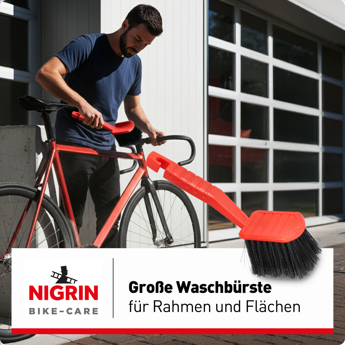 Große Waschbürste: Ideal für die flächige Reinigung des Rahmens und anderer großer Fahrradteile.