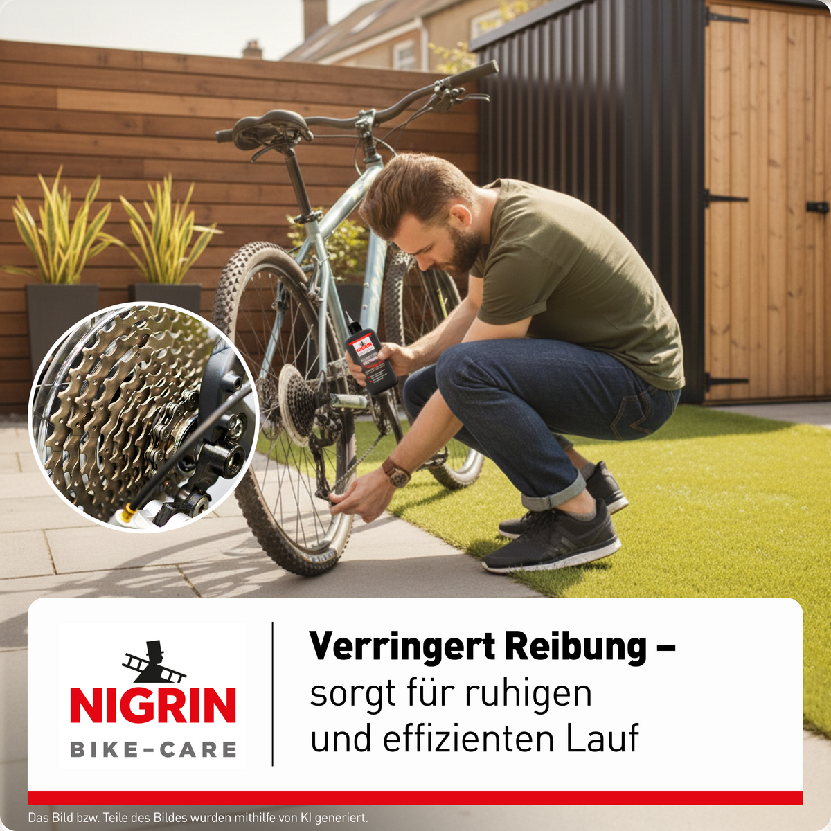 Zuvor Kette mit NIGRIN BIKE-CARE AntriebsBremsenReiniger entfetten. (Vor der Reinigung mittleren Gang wählen.)