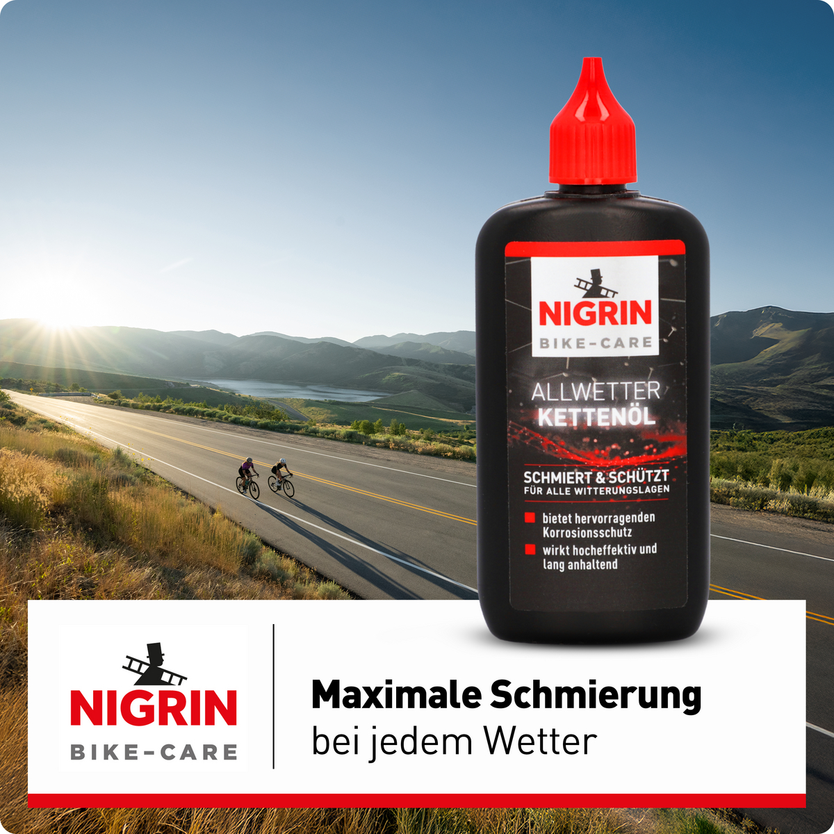 NIGRIN BIKE-CARE AllwetterKettenöl ist ein leistungsstarker Schmierstoff für alle Fahrradketten. Es schmiert und schützt lang anhaltend vor Verschleiß und Korrosion.