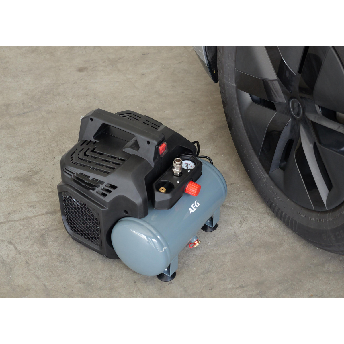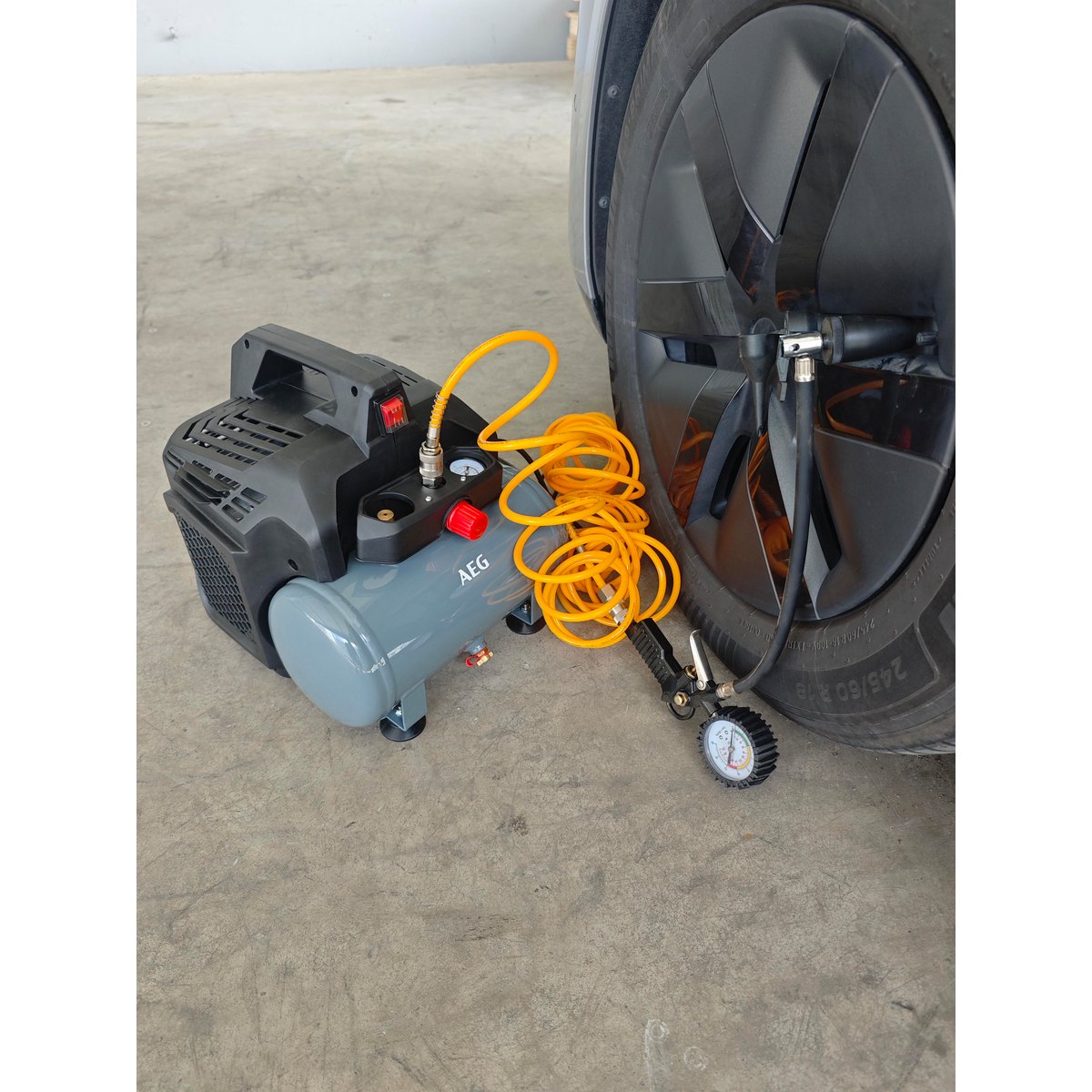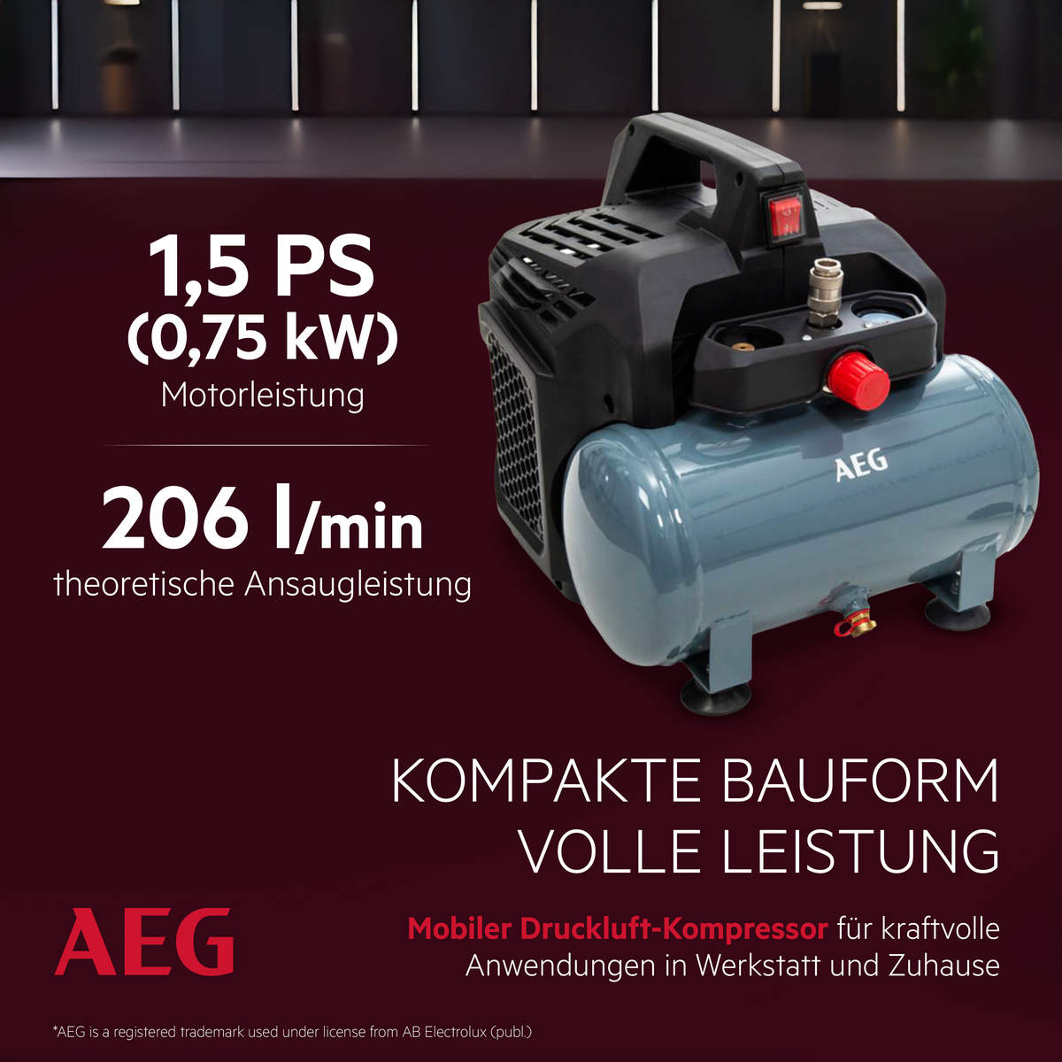 Der AEG Kompressor KL6 ist ein kompakter, ölfreier Druckluftkompressor mit 6-Liter-Tank für Werkstatt, Haushalt und Hobby. Mit einer Motorleistung von 1,5 PS (0,75 kW), einem maximalen Arbeitsdruck von 8 bar und einer theoretischen Ansaugleistung von 206 Litern pro Minute eignet er sich für vielseitige Anwendungen von Reifenbefüllung über Druckluftwerkzeuge bis hin zu Lackier- und Airbrusharbeiten.