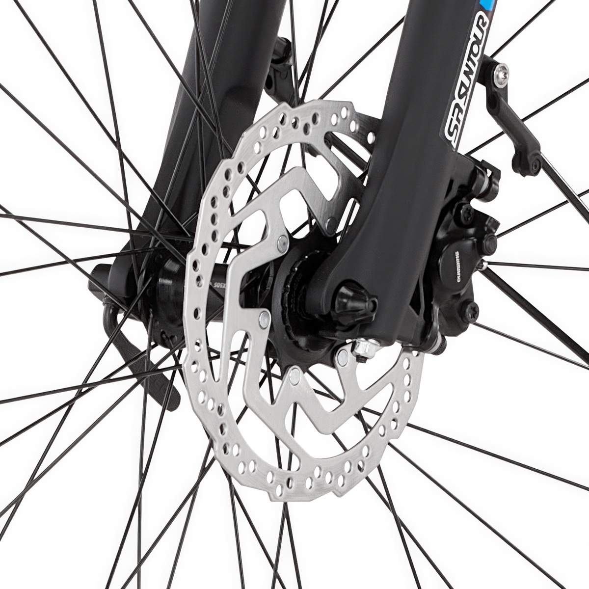 Die SHIMANO 9-Gang-Kettenschaltung bietet eine bewährte Übersetzungsbandbreite für unterschiedliche Streckenprofile. In Kombination mit der Federgabel werden Unebenheiten auf Asphalt oder Schotter spürbar reduziert. Hydraulische SHIMANO Scheibenbremsen sorgen für kontrollierte Verzögerung auch bei Nässe und erhöhen die Sicherheit im Alltag.