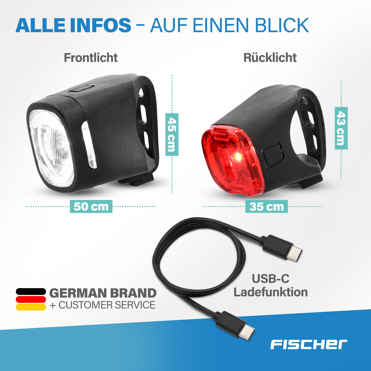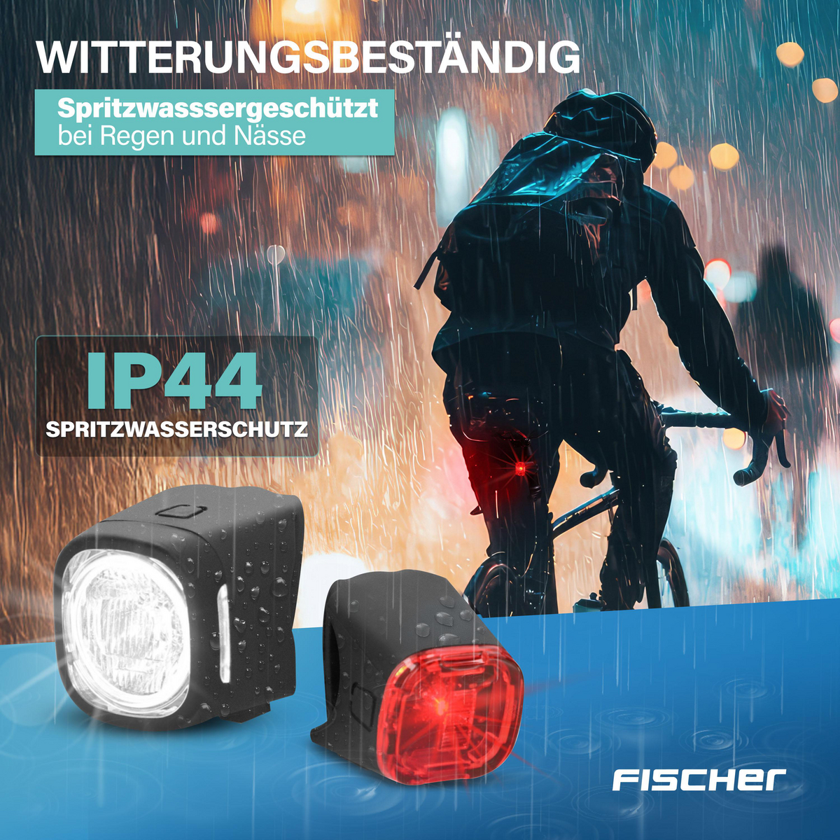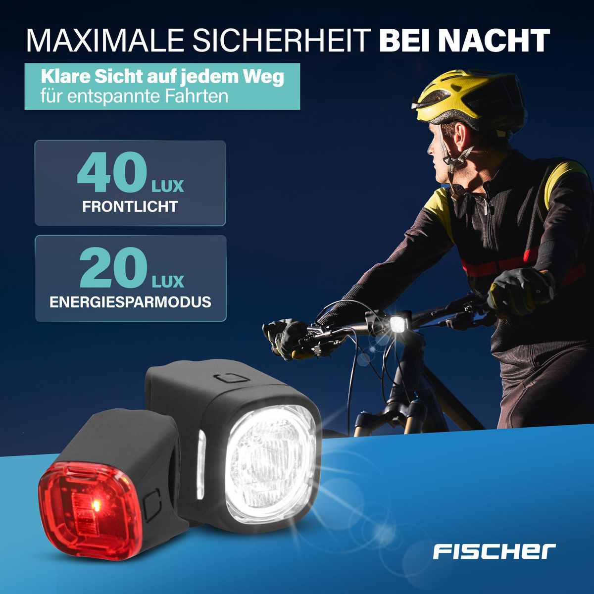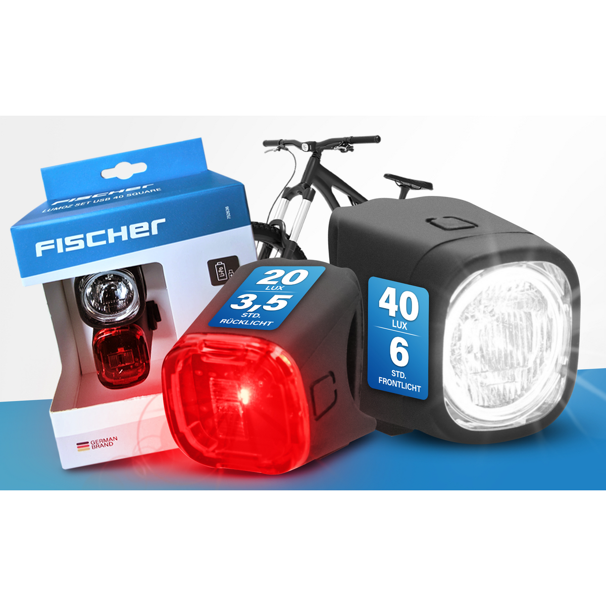 Sicher, flexibel und modern – das FISCHER Akku Beleuchtungsset SQUARE 40/20 Lux bietet alles, was Sie für gute Sicht und Sichtbarkeit auf dem Fahrrad brauchen.