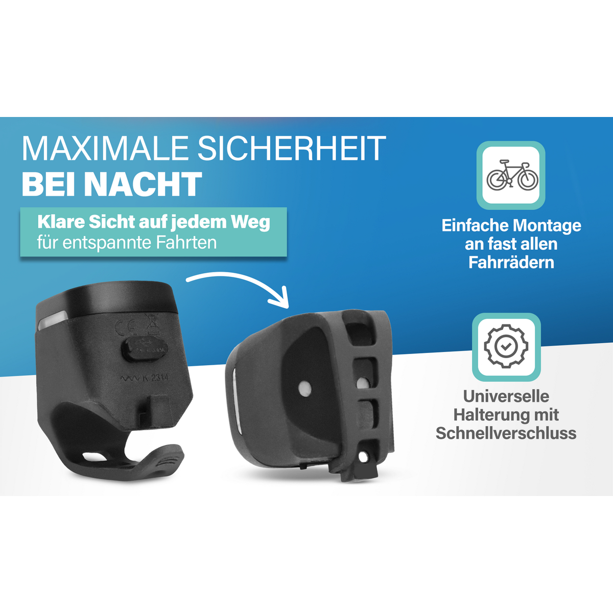 Die werkzeuglose Montage gelingt im Handumdrehen: Mit der Universalhalterung und dem Schnellverschluss befestigen Sie das Set an nahezu jedem Fahrradtyp und nehmen es bei Bedarf einfach wieder ab.