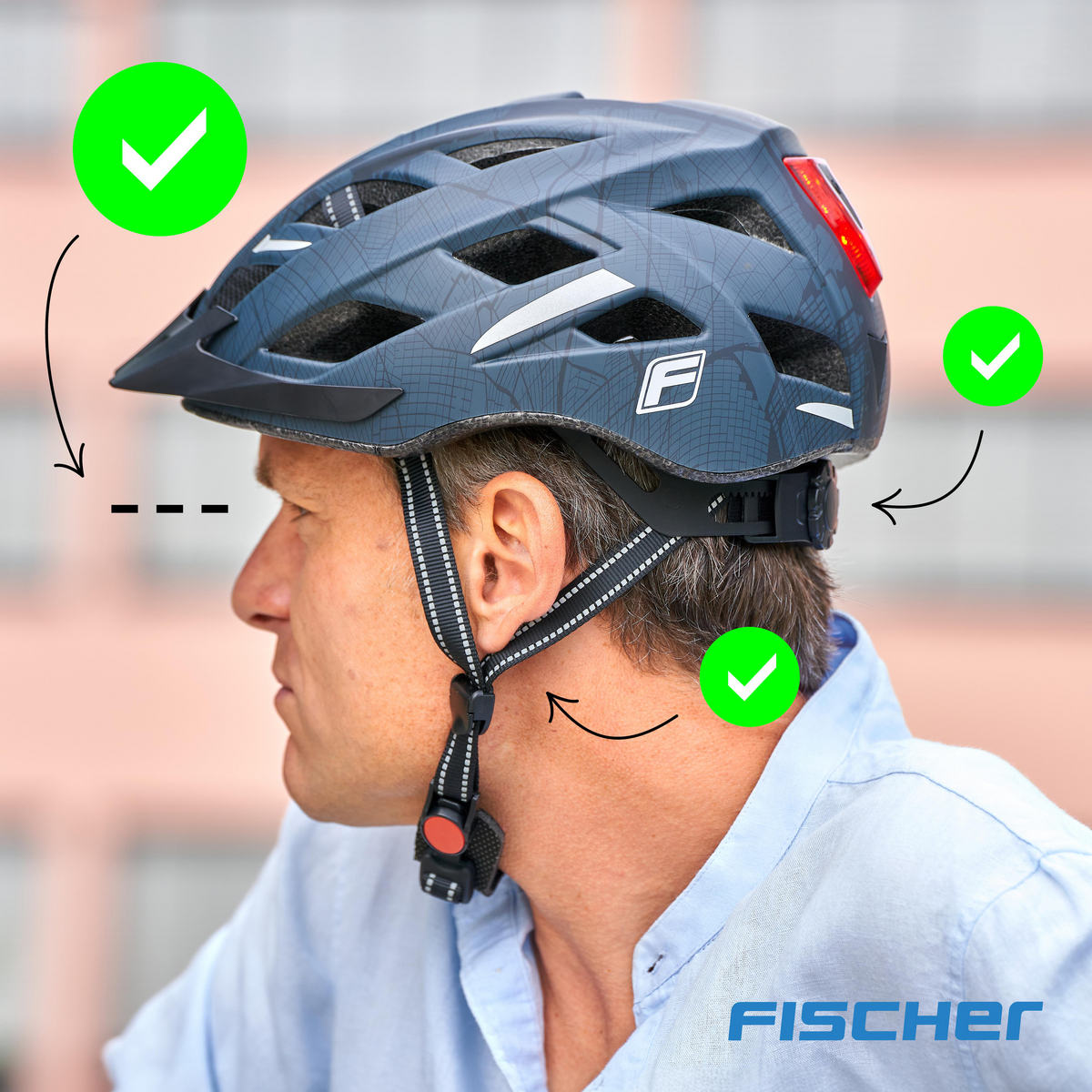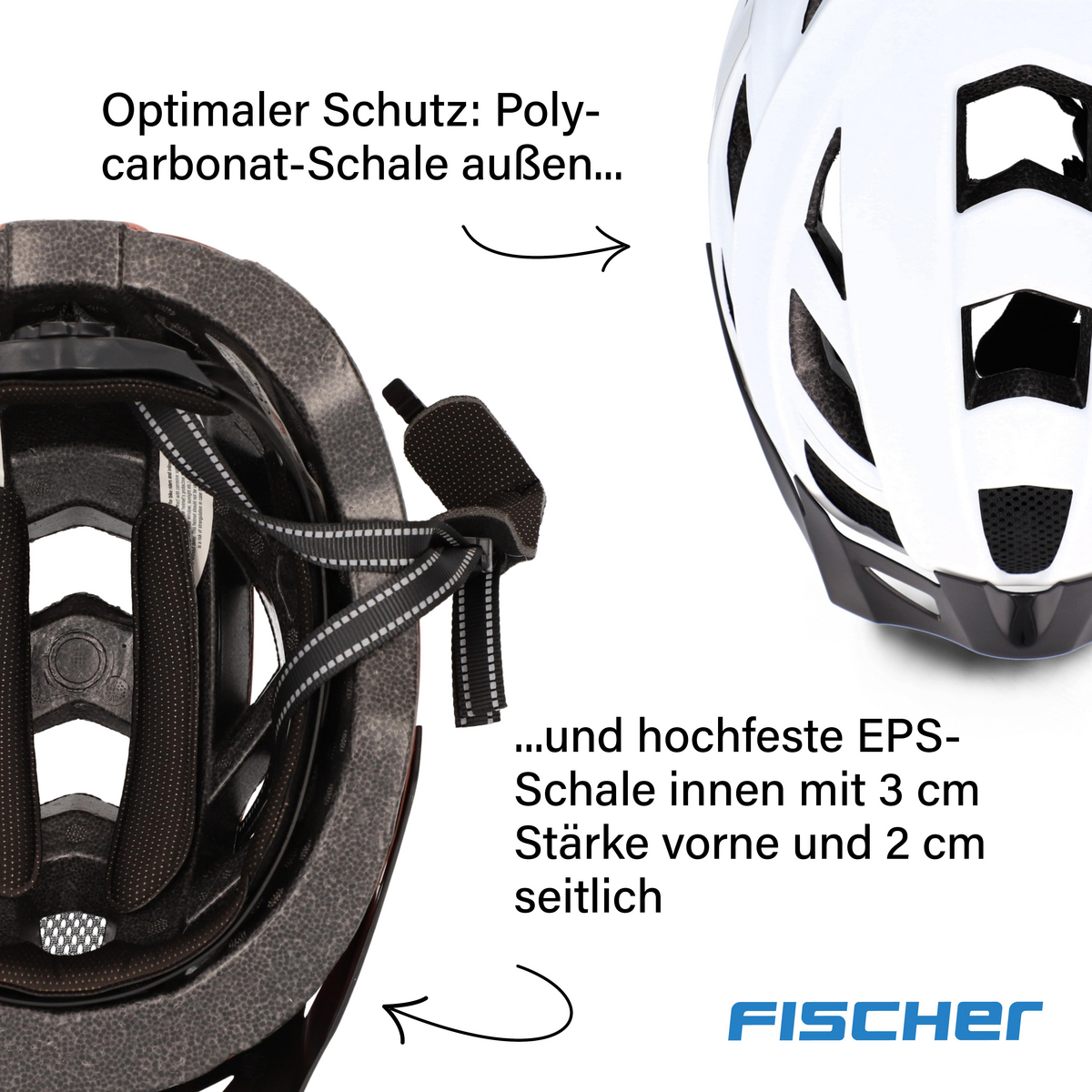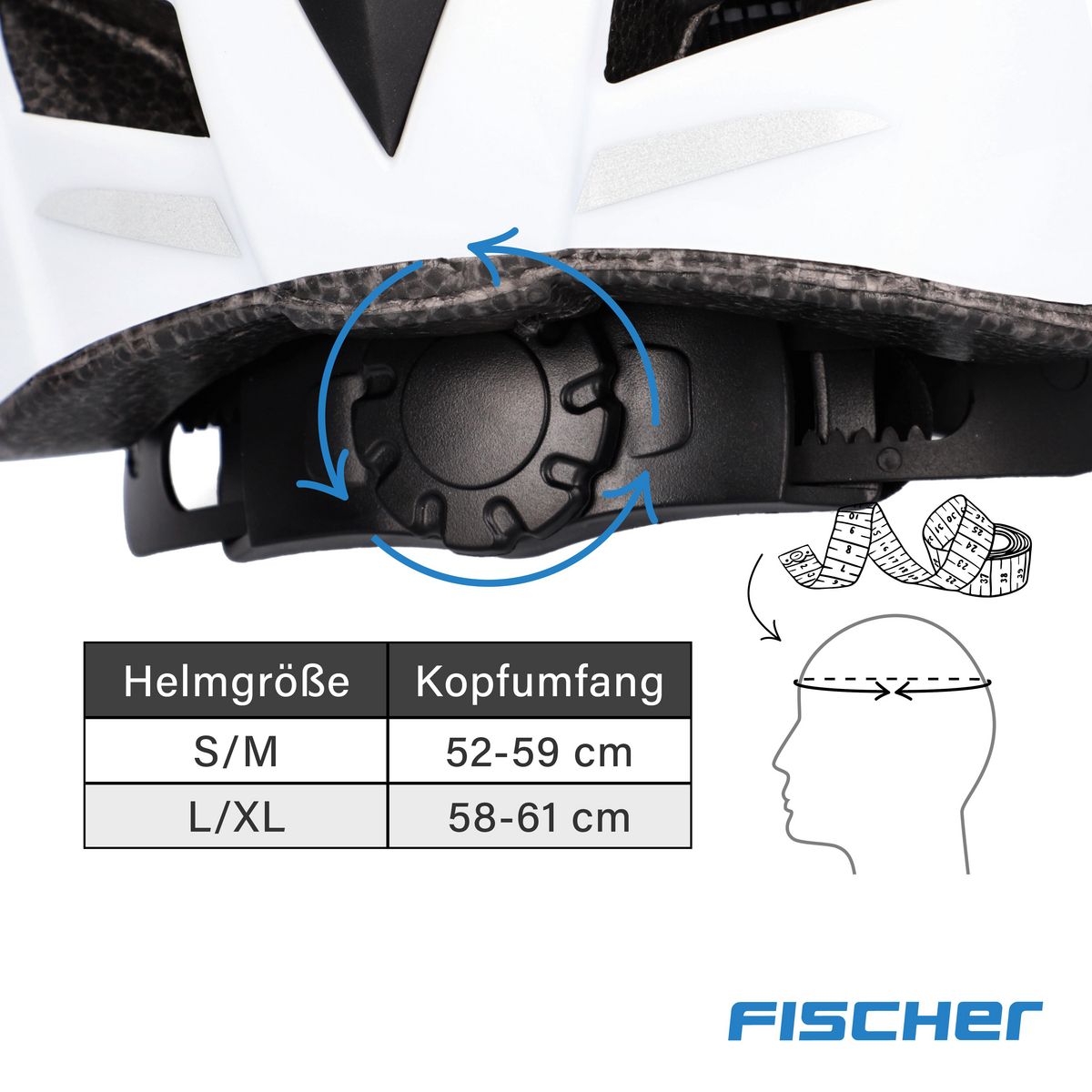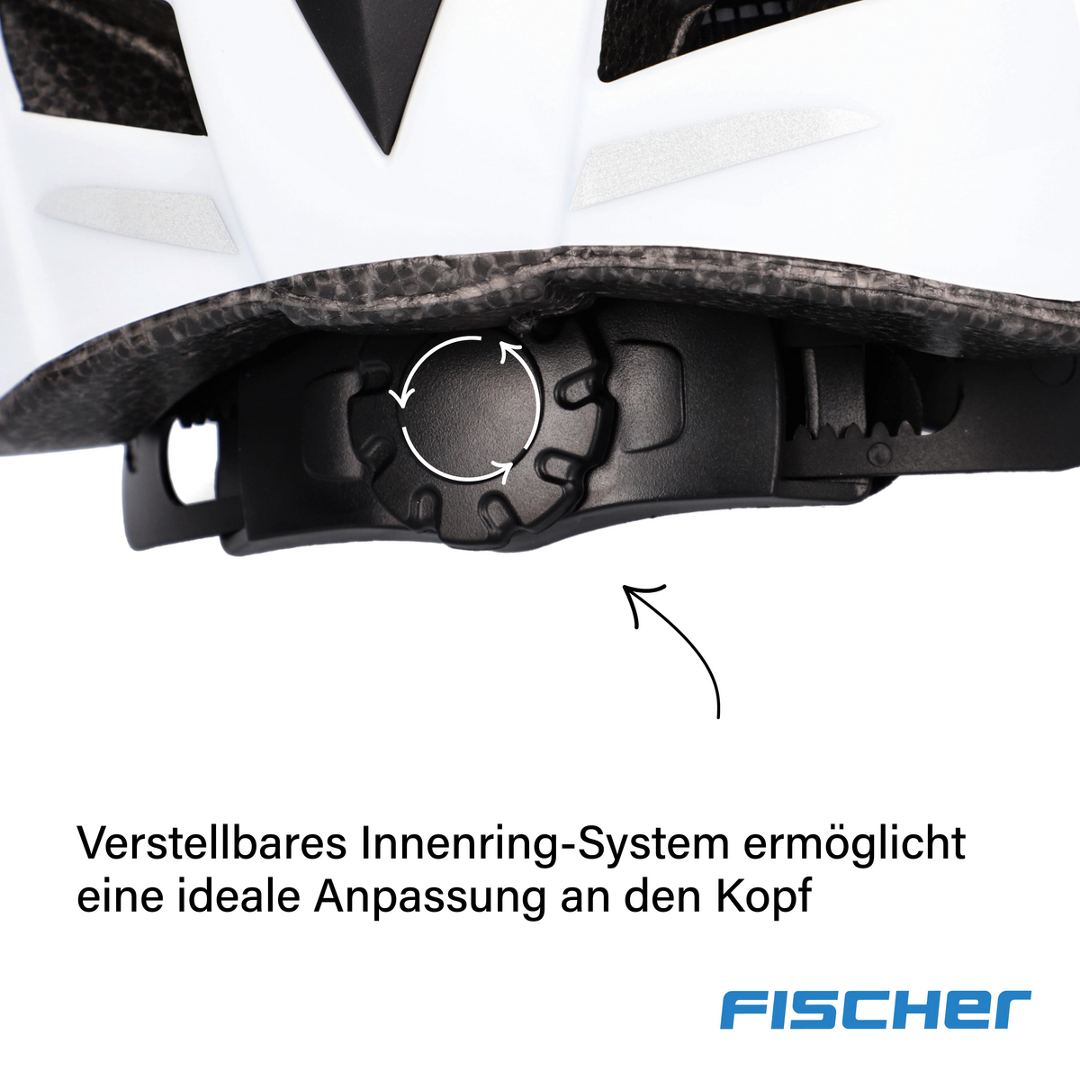 Der FISCHER Fahrradhelm Urban Plus New York erfüllt hohe Anforderungen an Sicherheit und Komfort. Zudem überzeugt der Fahrradhelm Urban Plus mit seiner modernen Optik in weiß. Die Helmserie ist speziell auf einen optimierten Schutz ausgelegt. Zu der extrem stabilen Schale aus Polycarbonat kommt die hochfeste EPS-Innenschale, die den Kopf vor Verletzungen schützt. Bei Stiftung Warentest (07/21) schnitt der FISCHER Urban Plus entsprechend als bester Fahrradhelm in Sachen Unfallschutz ab und erhielt die Gesamtnote „gut“. In der Dämmerung und in der Nacht sorgen die Reflexstreifen am Helm FISCHER Urban Plus für eine gute Sichtbarkeit. Noch deutlicher ist das große, helle Rücklicht zu sehen, das unterschiedliche Leuchtfunktionen bietet. Mit dem reflektierenden Gurtsystem sind die Radfahrer auf der Straße noch besser zu erkennen. Der Helmgurt mit Ratschenverschluss verfügt über ein praktisches Schutzsystem, das die Benutzer vor dem Einklemmen der Haut bewahrt. Ein weiteres wichtiges Kriterium ist der Komfort. Mit seiner optimalen Passform ist der FISCHER Urban Plus Fahrradhelm eine gute Wahl. Sein verstellbares Innenring-System ermöglicht eine ideale Anpassung an den Kopf. Wichtig für die Größenauswahl: Der Fahrradhelm Urban Plus New York in der Größe S/M eignet sich für einen Kopfumfang von 58 bis 61 cm. Innen optimieren weiche Pads den Komfort. Sie bestehen aus einem atmungsaktiven Material und lassen sich zum Waschen einfach herausnehmen. Das sportliche Design macht den Urban Plus FISCHER Fahrradhelm zu einem beliebten Modell. Auch die innovative Technik ist typisch für die Top-Qualität von FISCHER. Sie zeigt sich unter anderem in den großen Lufteinlässen, die eine gute Belüftung gewährleisten.