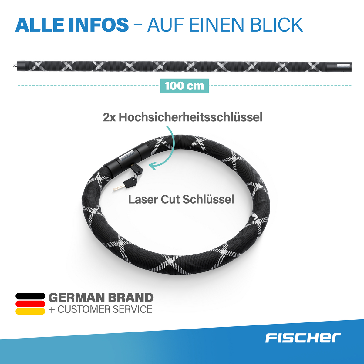In die Ummantelung integrierte Reflexfäden erhöhen die Sichtbarkeit bei Dunkelheit. Das verbessert die Sicherheit im Straßenverkehr, insbesondere beim Abstellen am Straßenrand oder in schlecht beleuchteten Bereichen. Das Schloss wird mit zwei Hochsicherheits-Schlüsseln geliefert, sodass jederzeit ein Ersatz griffbereit ist. Die klassische schwarze Optik rundet das hochwertige Gesamtbild ab.