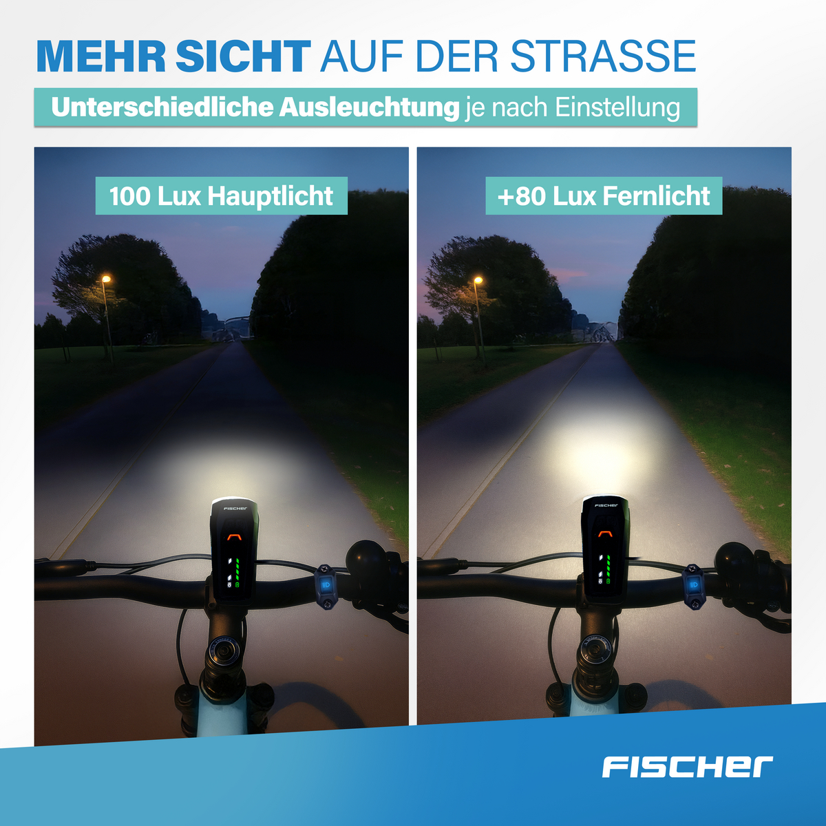 Maximale Sicht, maximale Sicherheit – mit dem FISCHER LED-Fahrradlicht 100 Lux + 80 Lux Fernlicht.