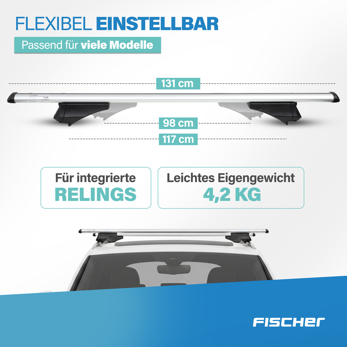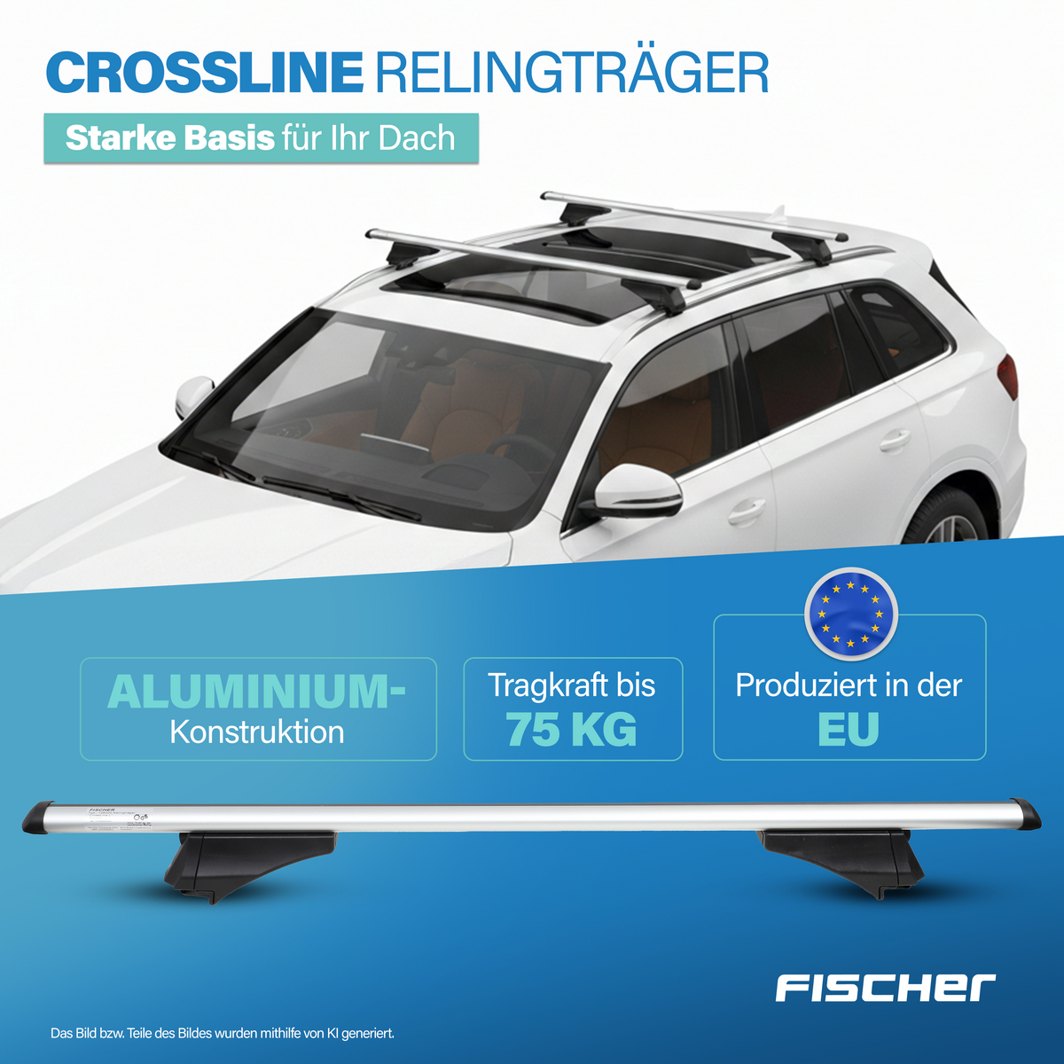 Mit dem FISCHER Relingträger CrossLine lässt sich das Dach eines Fahrzeugs ohne Aufwand für die Aufnahme eines Dachgepäckträgers vorbereiten. Das System ist für die Montage an integrierten Dachreling-Profilen geeignet. Durch die stufenlose Verstellbarkeit ist der Relingträger von FISCHER mit einem breiten Spektrum an Fahrzeugmodellen kompatibel. Die Installation gelingt dank der Vormontage schnell und einfach. Für die Anbringung selbst ist nur ein Sechskant-Inbusschlüssel erforderlich. Auf dem Relingträger lassen sich Fahrradträger, Skihalter oder Gepäckboxen sowie ähnliche Systeme installieren. Über die 20-mm-Nut bieten sich Möglichkeiten zur Befestigung unterschiedlicher Dachgepäckträgersysteme. Die maximale Tragkraft liegt bei 75 kg, die Barrenstärke bei 48 mm x 28 mm und die Länge bei 1,20 m (L) bzw. 1,31 m (XL). Der Relingträger bringt ein Eigengewicht von rund 3,9 kg mit und ist vollständig aus stabilem Aluminium gefertigt. Aluminium reduziert das Eigengewicht und ist zudem besonders widerstandsfähig, sodass der Relingträger von FISCHER nicht rostanfällig ist. Der Träger ist Made in EU mit und besitzt die Prüfzeichen von TÜV bzw. GS. Mit einem staubgeschützten Schloss lässt sich der Relingträger fest mit dem Fahrzeug verbinden. So ist das System vor Diebstahl geschützt. Zum Lieferumfang gehören 2 Schlüssel dazu.