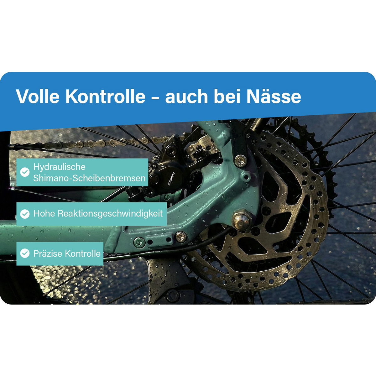 Für maximale Sicherheit sorgt die hydraulische Scheibenbremse, die auch bei höheren Geschwindigkeiten zuverlässig greift.