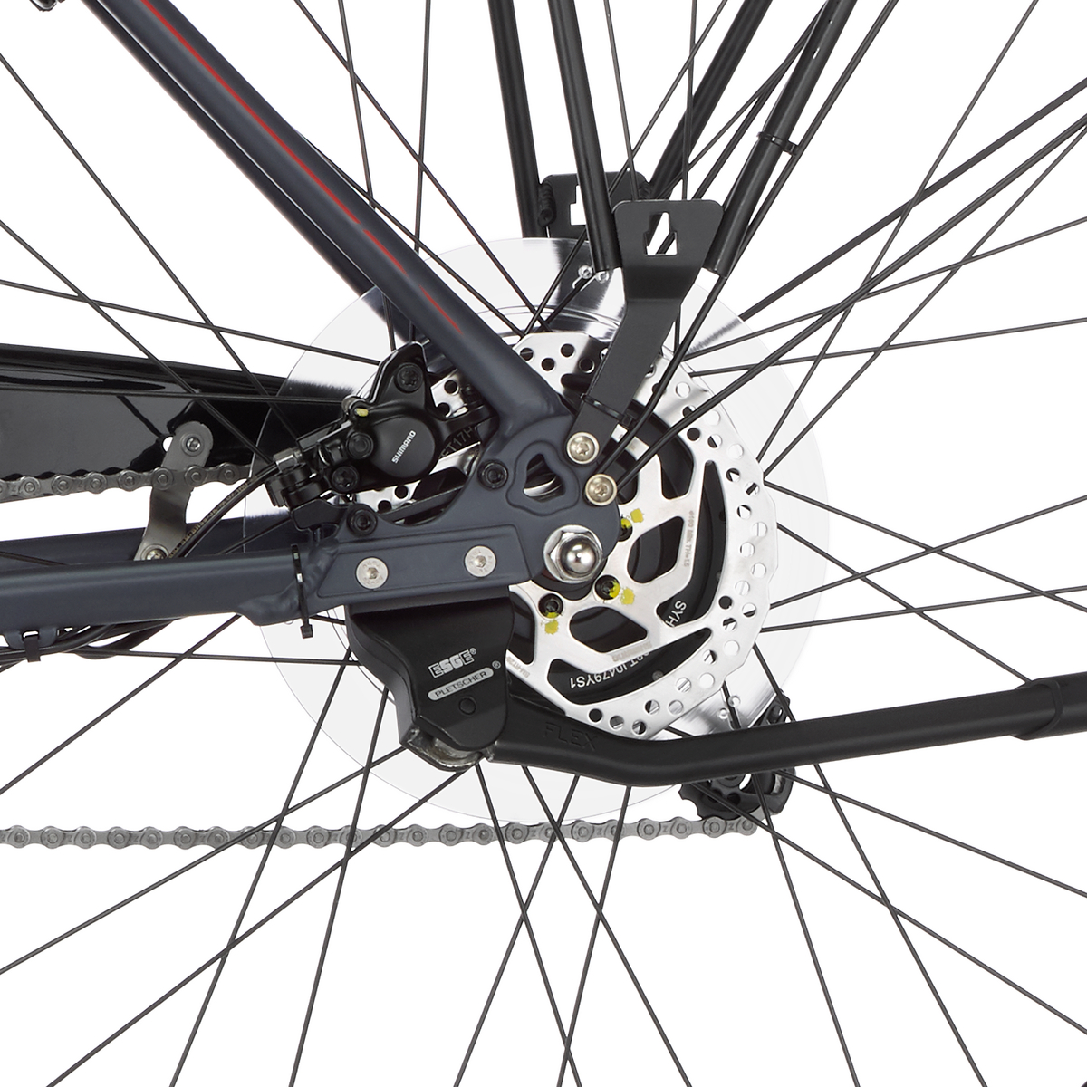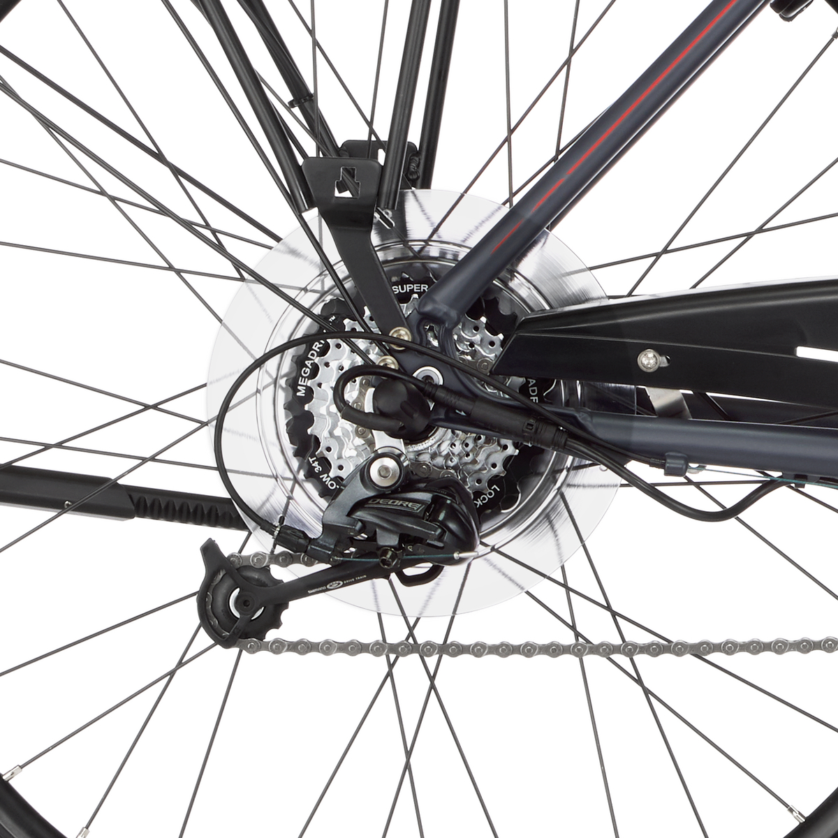 Mittelmotoren haben ihre Vorzüge, schränken jedoch den Umfang der Schaltung ein. Für ein klassisches Trekkingrad mit Dreifach-Kettenblatt ist der Heckmotor daher erste Wahl. Beim Trekking ETH/ETD 2222 liegt der Fokus auf großer Reichweite und bester Funktion. Antriebsseitig bietet das Rad daher 557-Wattstunden-Akku plus Bluetooth-fähiges Display mit Navigations-App als Download. Auch die Komponenten überzeugen: Starke Scheibenbremsen, die Kombination aus superhellem Frontstrahler und Bremslicht sowie ein robustes Rahmenschloss sorgen für Sicherheit unterwegs.