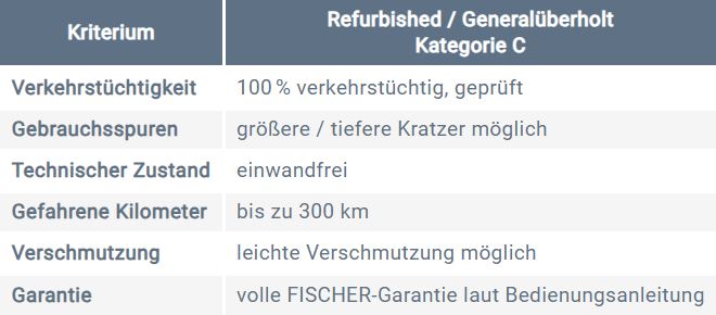 | Kriterium | Neuware | Neuware mit leichten optischen Mängeln | Neuware mit optischen Mängeln | Refurbished / Generalüberholt Kategorien B & C |