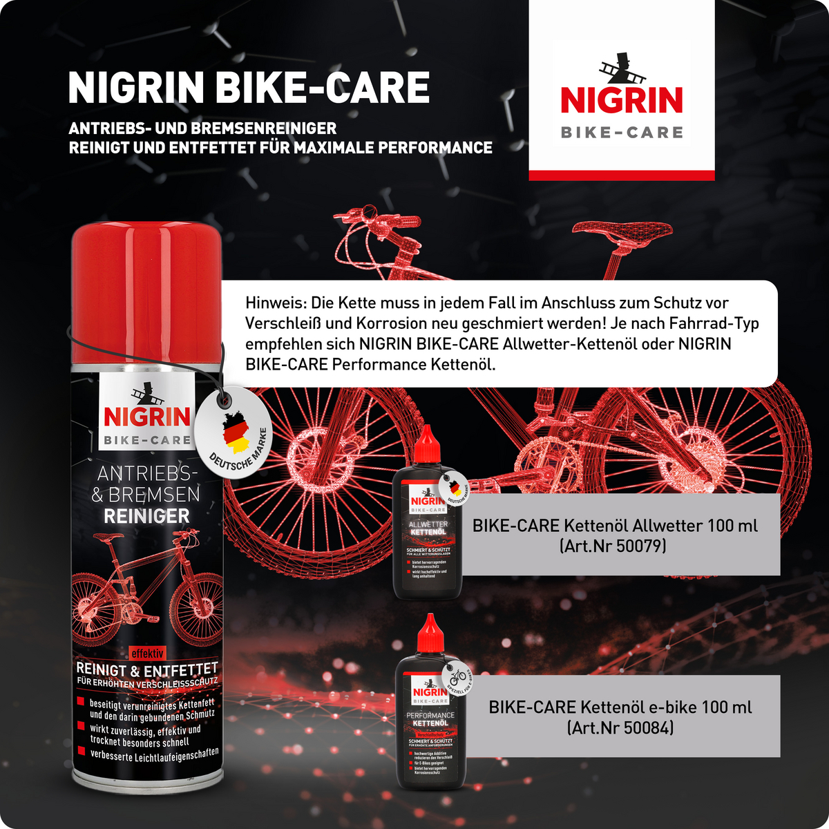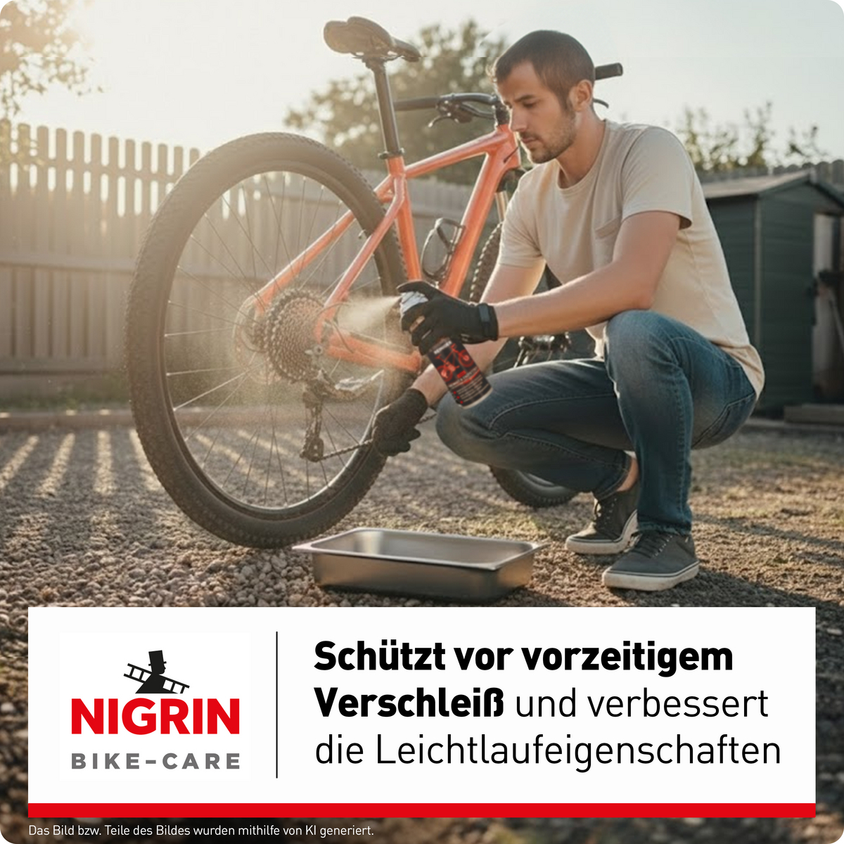Die regelmäßige Reinigung von Antriebs- und Bremsanlage mit NIGRIN BIKE-CARE AntriebsBremsenReiniger beugt vorzeitigem Verschleiß vor und sorgt ebenso für den Werterhalt wie für Funktionssicherheit und verbesserte Leichtlaufeigenschaften.