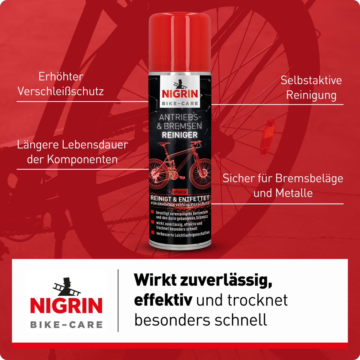 NIGRIN BIKE-CARE AntriebsBremsenReiniger beseitigt verunreinigte Schmierfette/-öle von Ketten und Antriebskomponenten, wie Zahnkranz/Kassette sowie Trommel- oder Scheiben-Bremsanlagen, inkl. Belägen, Anbauteilen, Bremssätteln: Der in den Fetten/Ölen gebundene Schmutz wird damit entfernt.