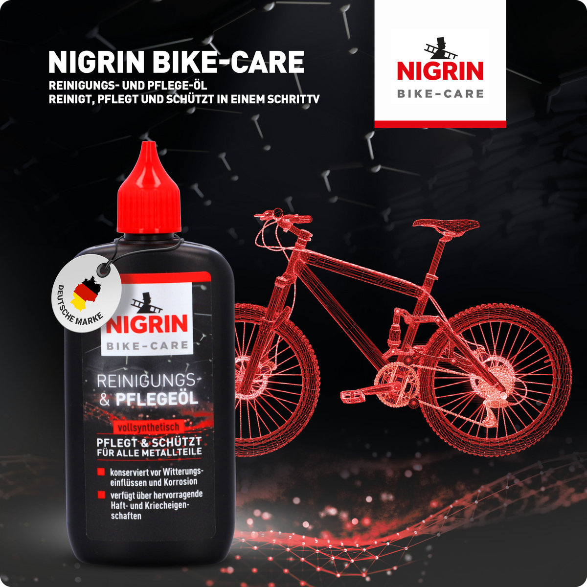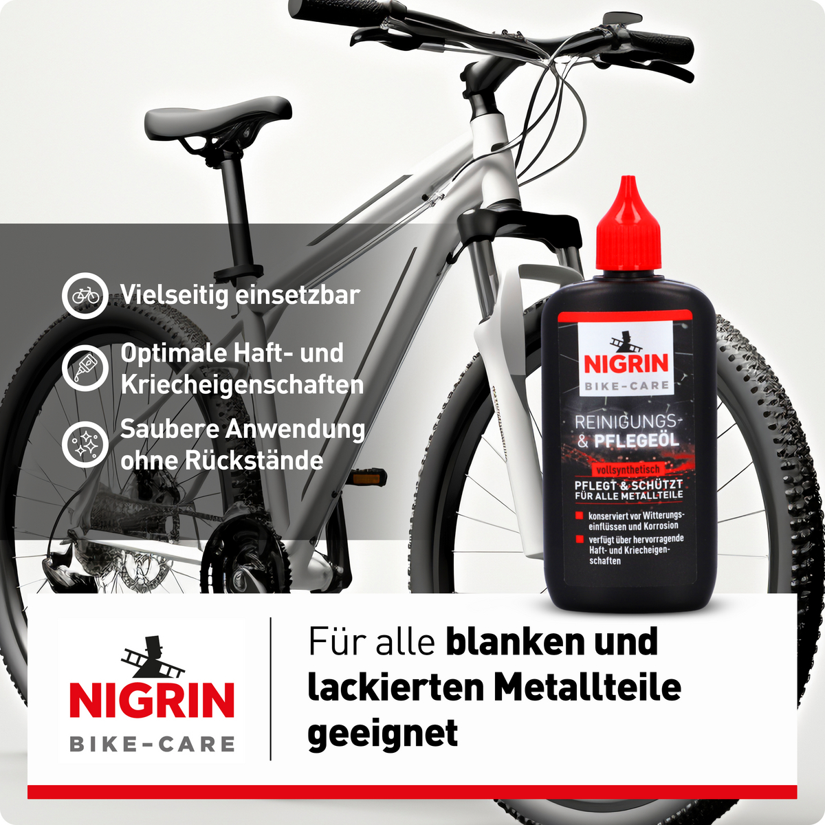 NIGRIN BIKE-CARE ReinigungsPflegeöl ist ein vollsynthetisches, leistungsstarkes Öl für die Reinigung, Pflege und Konservierung von allen Metallteilen an Fahrrädern und E-Bikes. Es verfügt über ein sehr gutes Haft-, Kriech- und Viskositäts-Temperatur-Verhalten (bei Kälte und Wärme).