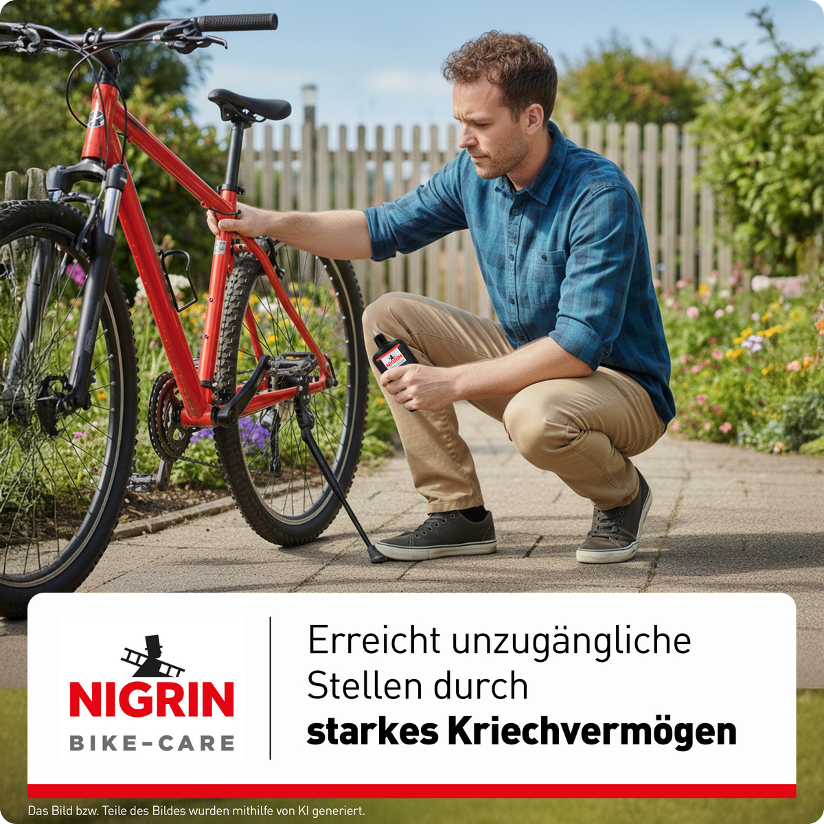NIGRIN BIKE-CARE ReinigungsPflegeöl schützt vor Witterungseinflüssen, Korrosion und vorzeitigem Verschleiß, denn es verringert auch den Reibwiderstand bei beweglichen Metallteilen, wie z. B. Federgabeln, Umwerfern, Bremshebeln etc.