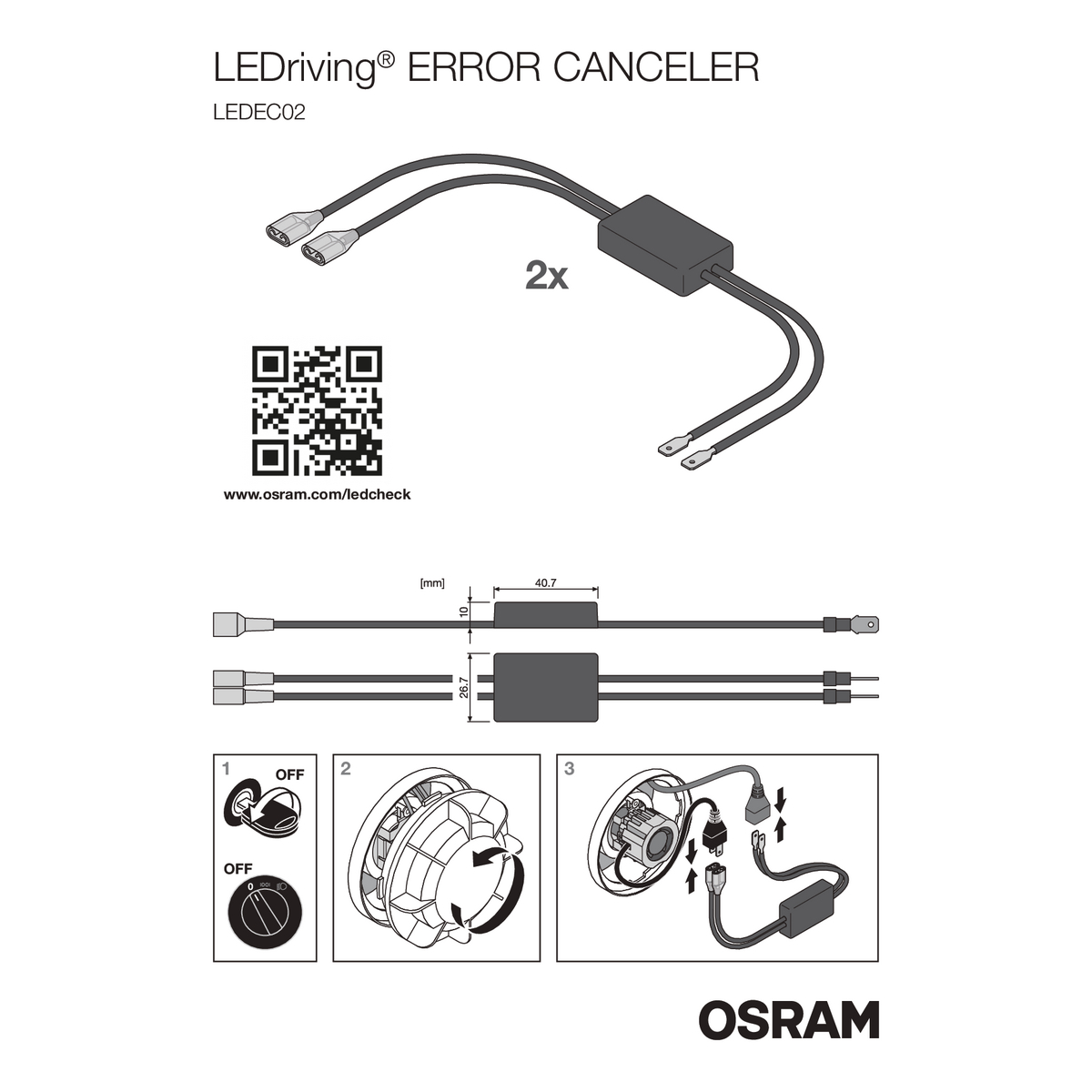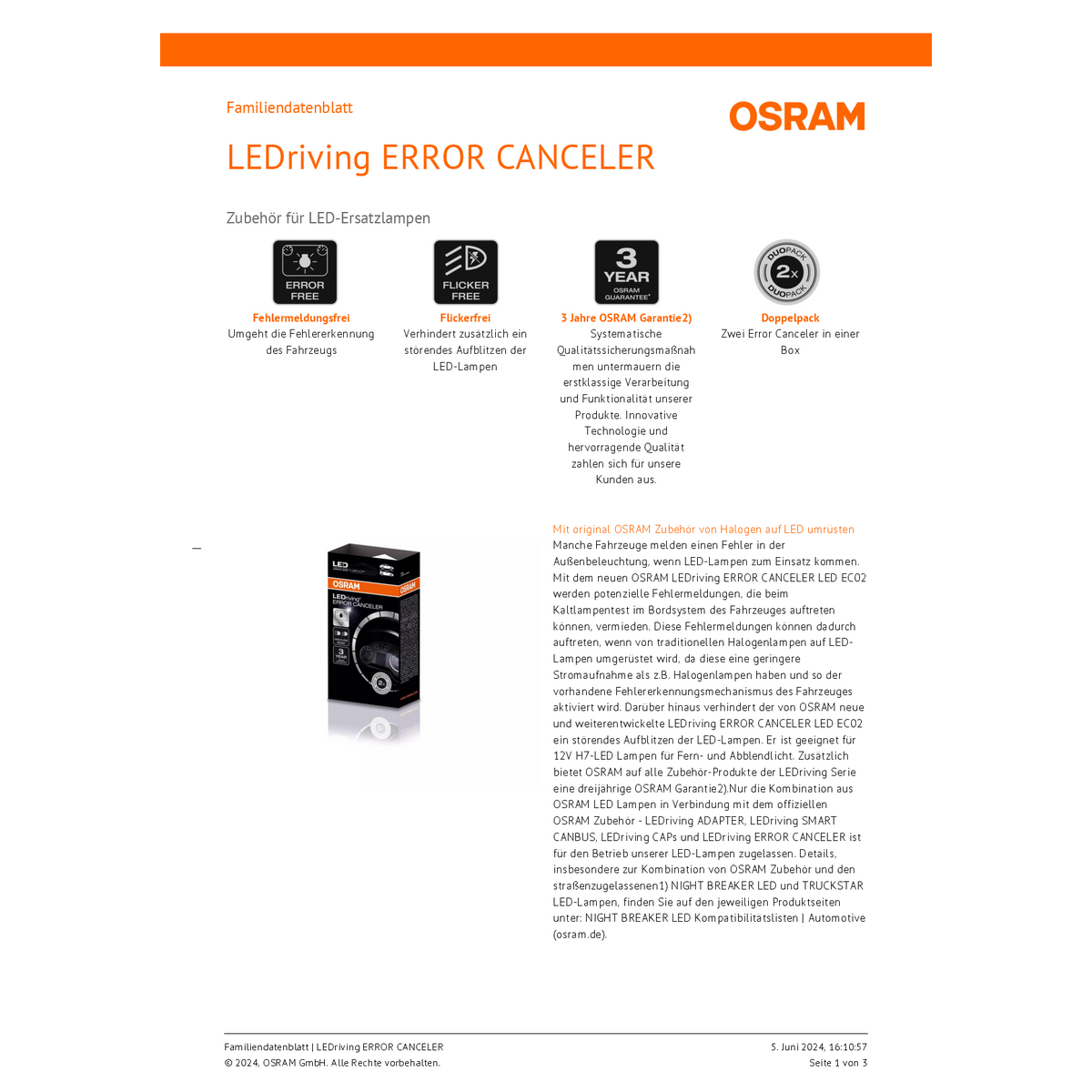 Mit original OSRAM Zubehör von Halogen auf LED umrüsten Manche Fahrzeuge melden einen Fehler in der Außenbeleuchtung, wenn LED-Lampen zum Einsatz kommen. Mit dem neuen OSRAM LEDriving ERROR CANCELER LED EC02 werden potenzielle Fehlermeldungen, die beim Kaltlampentest im Bordsystem des Fahrzeuges auftreten können, vermieden. Diese Fehlermeldungen können dadurch auftreten, wenn von traditionellen Halogenlampen auf LED-Lampen umgerüstet wird, da diese eine geringere Stromaufnahme als z.B. Halogenlampen haben und so der vorhandene Fehlererkennungsmechanismus des Fahrzeuges aktiviert wird. Darüber hinaus verhindert der von OSRAM neue und weiterentwickelte LEDriving ERROR CANCELER LED EC02 ein störendes Aufblitzen der LED-Lampen. Er ist geeignet für 12V H7-LED Lampen für Fern- und Abblendlicht. Zusätzlich bietet OSRAM auf alle Zubehör-Produkte der LEDriving Serie eine dreijährige OSRAM Garantie2).Nur die Kombination aus OSRAM LED Lampen in Verbindung mit dem offiziellen OSRAM Zubehör - LEDriving ADAPTER, LEDriving SMART CANBUS, LEDriving CAPs und LEDriving ERROR CANCELER ist für den Betrieb unserer LED-Lampen zugelassen. Details, insbesondere zur Kombination von OSRAM Zubehör und den straßenzugelassenen1) NIGHT BREAKER LED und TRUCKSTAR LED-Lampen, finden Sie auf den jeweiligen Produktseiten unter: NIGHT BREAKER LED Kompatibilitätslisten | Automotive (osram.de).
