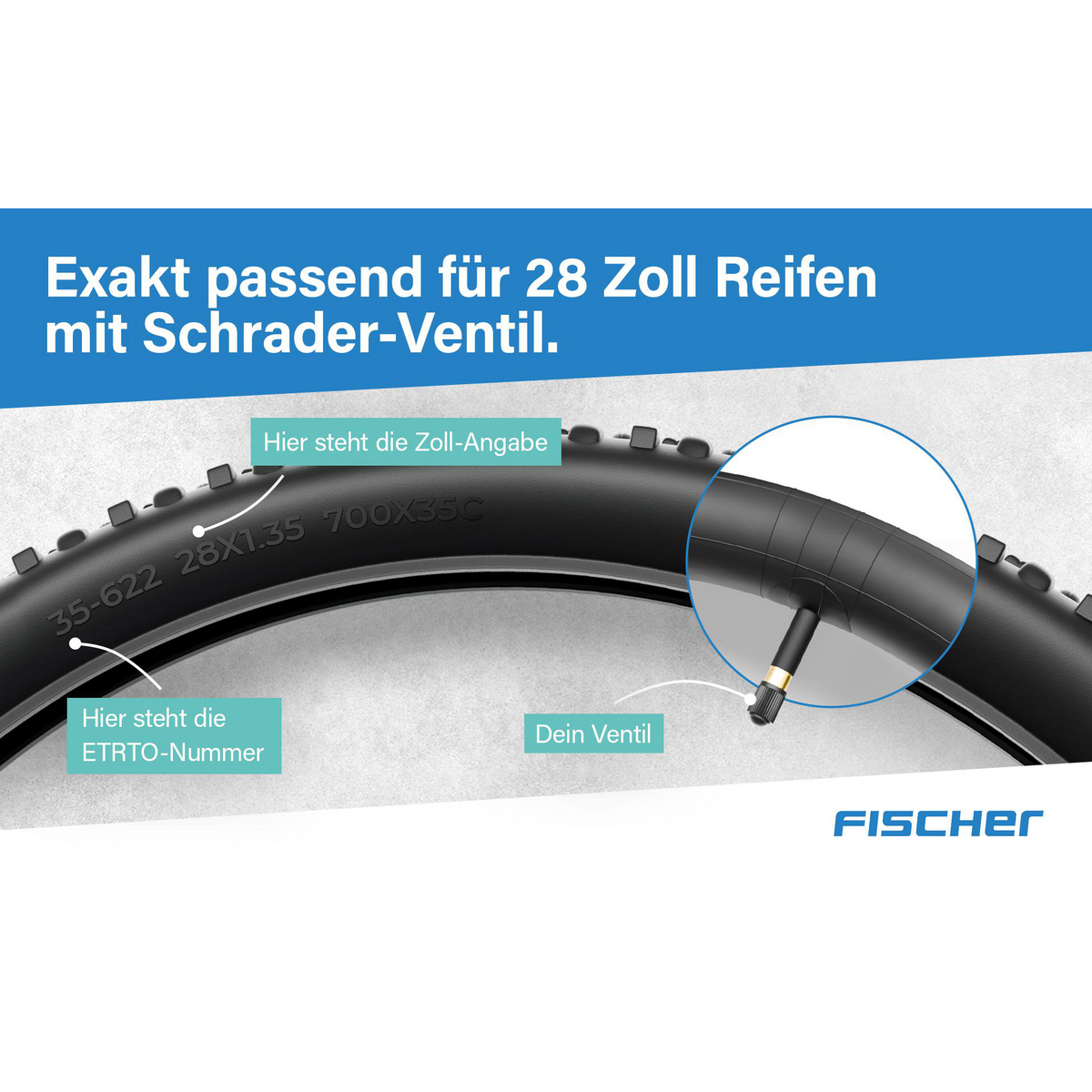 Ihr Fahrrad hat einen Platten? Sie sind durch Glasscherben gefahren und nun ist der Schlauch hinüber? Verlassen Sie sich auf FISCHER, wenn es um den richtigen Schlauch für Ihre Fahrrad geht. Welcher ist der Richtige? Sie können dies an der Seite Ihres Fahrradreifens ablesen, dort steht die die Größe, die Sie benötigen. Dieser FISCHER Fahrradschlauch ist für Räder mit 28“ Größe geeignet. Die ETRTO Daten (European Tyre and Rim Technical Organisation) 37/45-622 stehen vorne für die Reifenbreite in Millimetern, die anderen drei Ziffern zeigen den inneren Durchmesser des Reifens in Millimetern an. 45-622 steht für einen 28 Zoll-Reifen mit 622 Millimeter Durchmesser und einer Breite von 45 Millimeter. Bitte prüfen Sie auf der Seite Ihres Reifens oder auf Ihrem alten Schlauch die richtige Größe, den Ventiltyp und die Ventillänge.