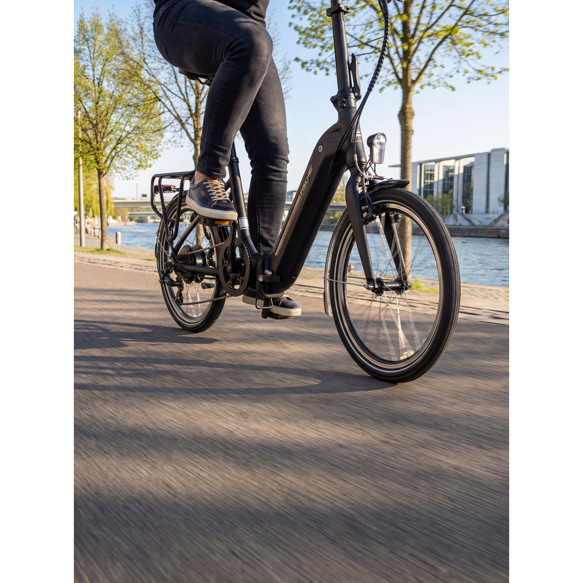 Die 20 Zoll Laufräder in Kombination mit der robusten Starrgabel sorgen für ein wendiges und direktes Fahrverhalten. Schutzbleche, Gepäckträger und ein vollständiges Beleuchtungssystem sind bereits vormontiert. Damit ist das E-Faltrad direkt startklar und für den Straßenverkehr ausgestattet.