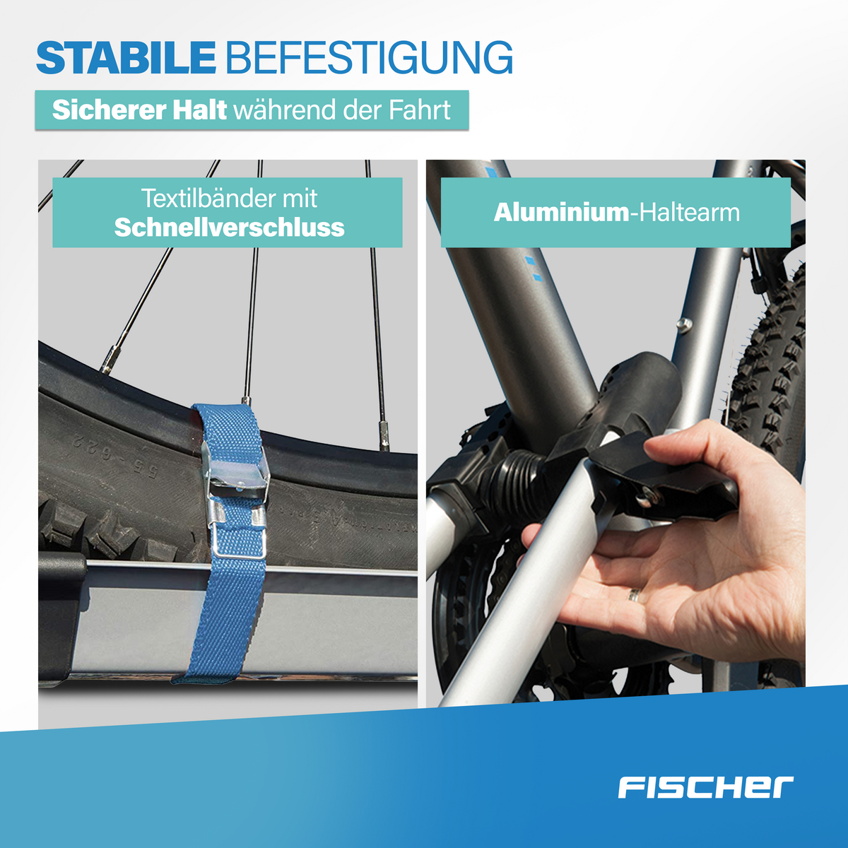 Die Befestigung des Fahrrades am Fahrradträger erfolgt werkzeuglos und einfach. Textilbänder mit komfortablem Schnellverschluss sowie ein schwenkbarer Haltearm aus Aluminium sorgen für einen sicheren Transport während der Fahrt (maximale Höchstgeschwindigkeit: 130 km/h).Die Möglichkeit des Abschließens verhindert das unbeabsichtigte Lösen des Fahrrades während der Fahrt.