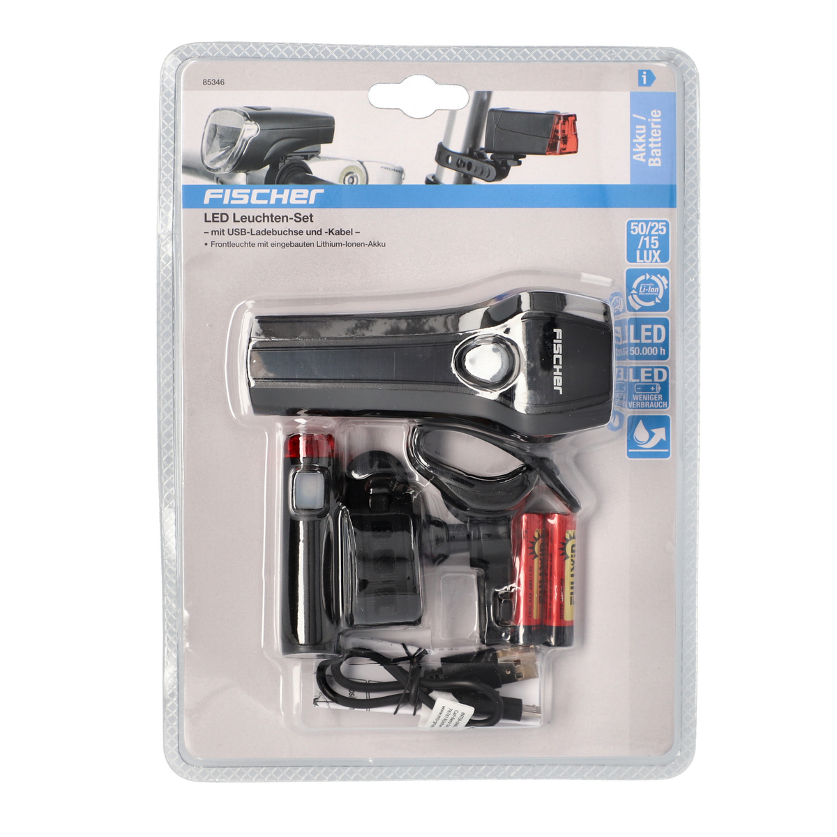 Wer mit dem Fahrrad auf öffentlichen Verkehrswegen unterwegs ist, der braucht eine funktionstüchtige Beleuchtung am Rad. Das gilt nicht nur, weil sie von der StVZO vorgeschrieben ist, sondern vor allem auch, weil das Fahrradlicht elementar für die Sicherheit auf dem Fahrrad ist. LED-Fahrradbeleuchtung hat gegenüber Glüh- oder Halogenlampen den Vorteil, dass sie heller leuchtet, langlebiger ist und weniger Energie verbraucht. Das FISCHER LED Leuchten-Set besteht aus einer Frontleuchte und einem Rücklicht. Die Frontleuchte verfügt über eine USB-Ladebuchse (Kabel wird mitgeliefert). Ein Batteriewechsel ist nicht notwendig da die Lithium-Ionen Akkus über das Ladekabel bis zu 750x aufladbar sind. Die Leuchte lässt sich dank 3fach verstellbarer Leuchtkraft optimal an die Sichtverhältnisse anpassen (15/25/50 Lux) Die Ladedauer beträgt ca. 3 Stunden. Das Rücklicht hat eine extrem starke Leuchtdiode und wird durch zwei mitgelieferte 1,5V AAA Batterien betrieben. Zur Montage benötigen Sie kein Werkzeug.