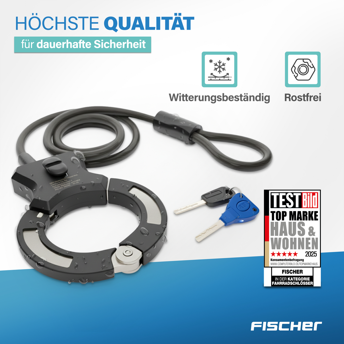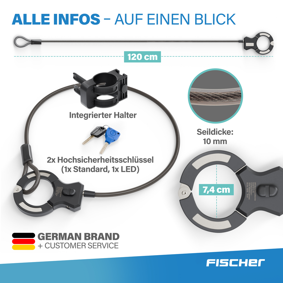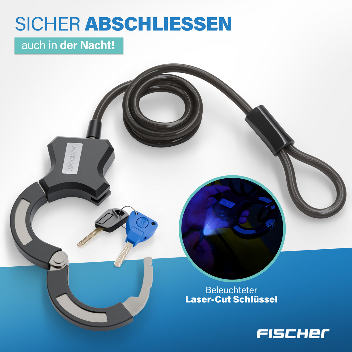 Im Lieferumfang sind zwei Schlüssel enthalten, von denen einer mit einer integrierten Beleuchtung ausgestattet ist. Das sorgt für zusätzlichen Komfort beim Aufschließen bei Dunkelheit. Leicht, handlich und vielseitig einsetzbar ist das FISCHER Spiralschloss eine zuverlässige Ergänzung für den täglichen Einsatz.
