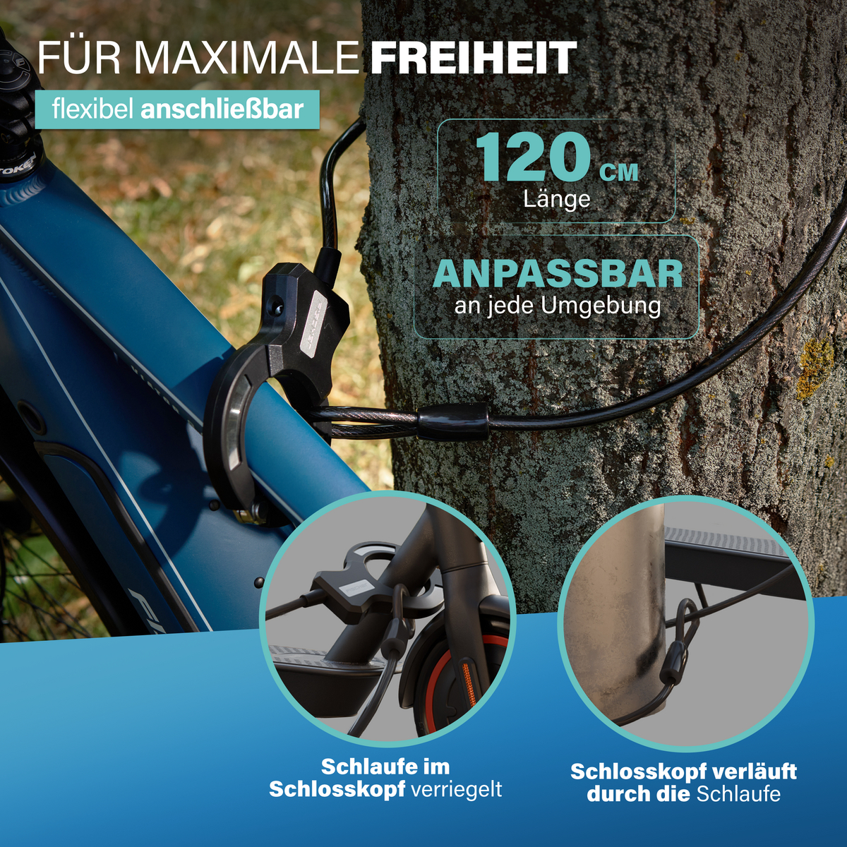 Mit einer Seillänge von 120 cm und einem Durchmesser von 10 mm lässt sich dein Fahrrad bequem an Laternen, Zäunen, Verkehrsschildern oder Fahrradständern anschließen. Die innovative Schellen-Konstruktion ermöglicht eine schnelle und unkomplizierte Befestigung an runden und ovalen Rohren. So ist dein Fahrrad im Handumdrehen gesichert, auch bei kurzen Stopps.