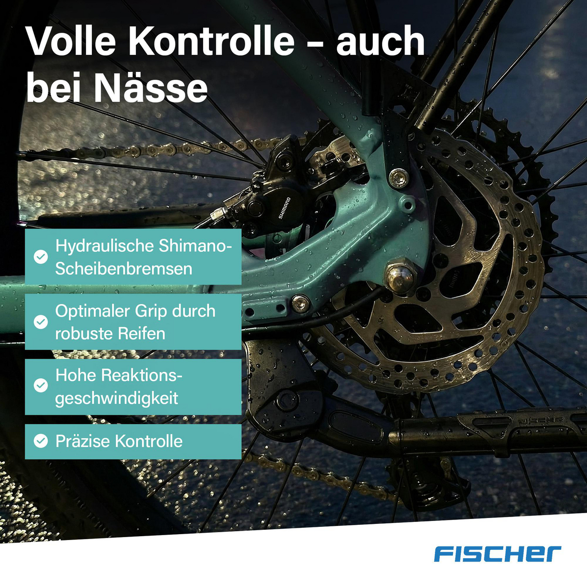 Für maximale Sicherheit sorgt die hydraulische Scheibenbremse, die auch bei höheren Geschwindigkeiten zuverlässig greift.
