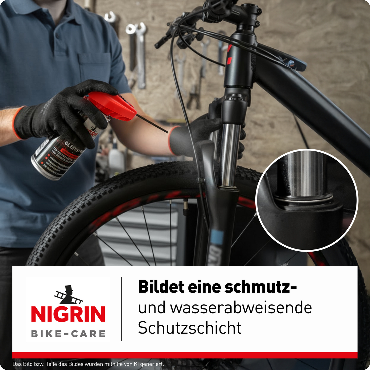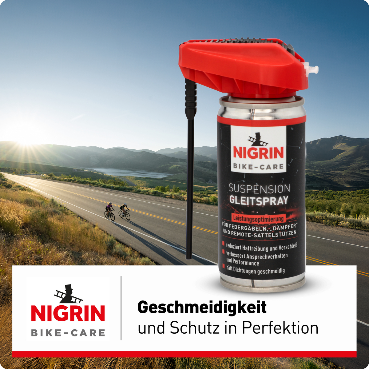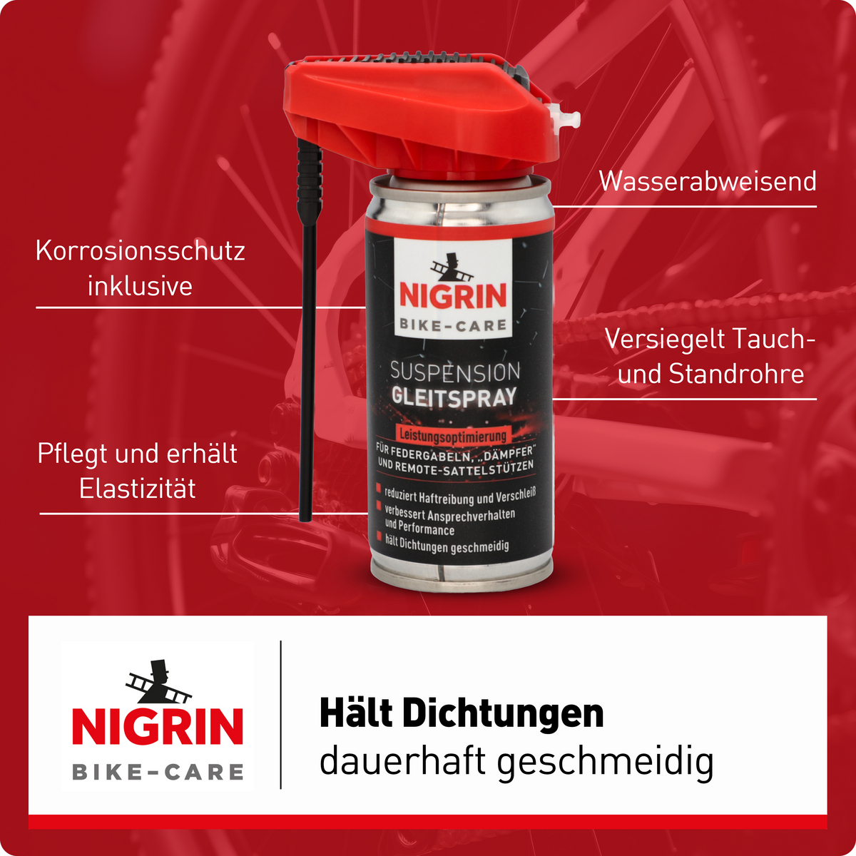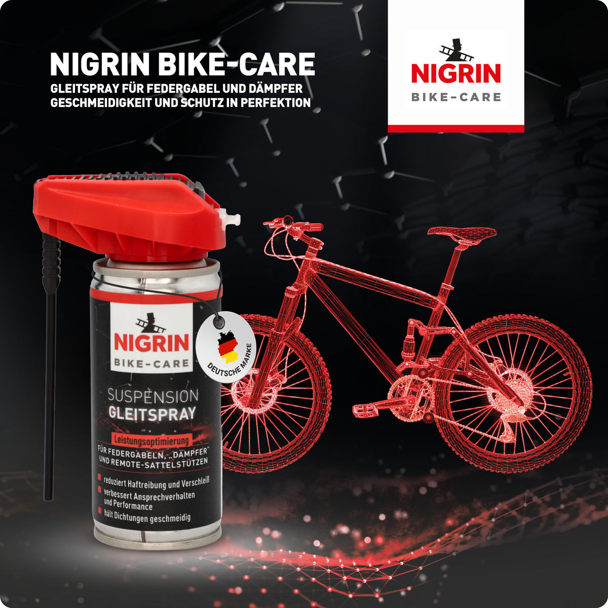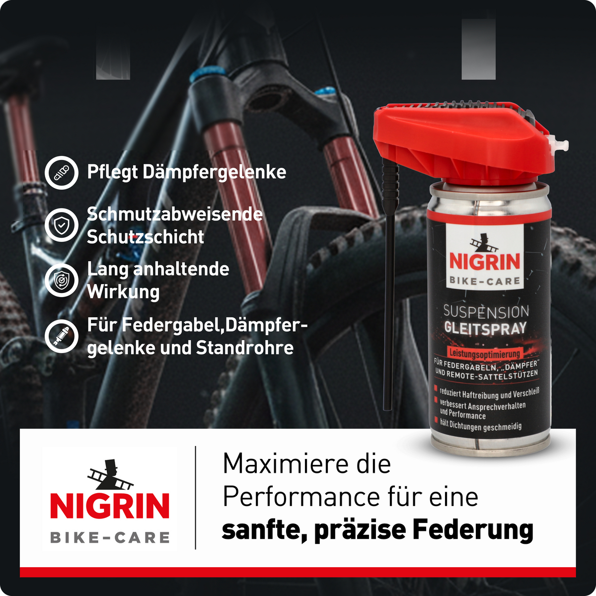 NIGRIN BIKE CARE Gleitspray für Federgabel & Dämpfer sorgt für Geschmeidigkeit und Schutz in Perfektion.