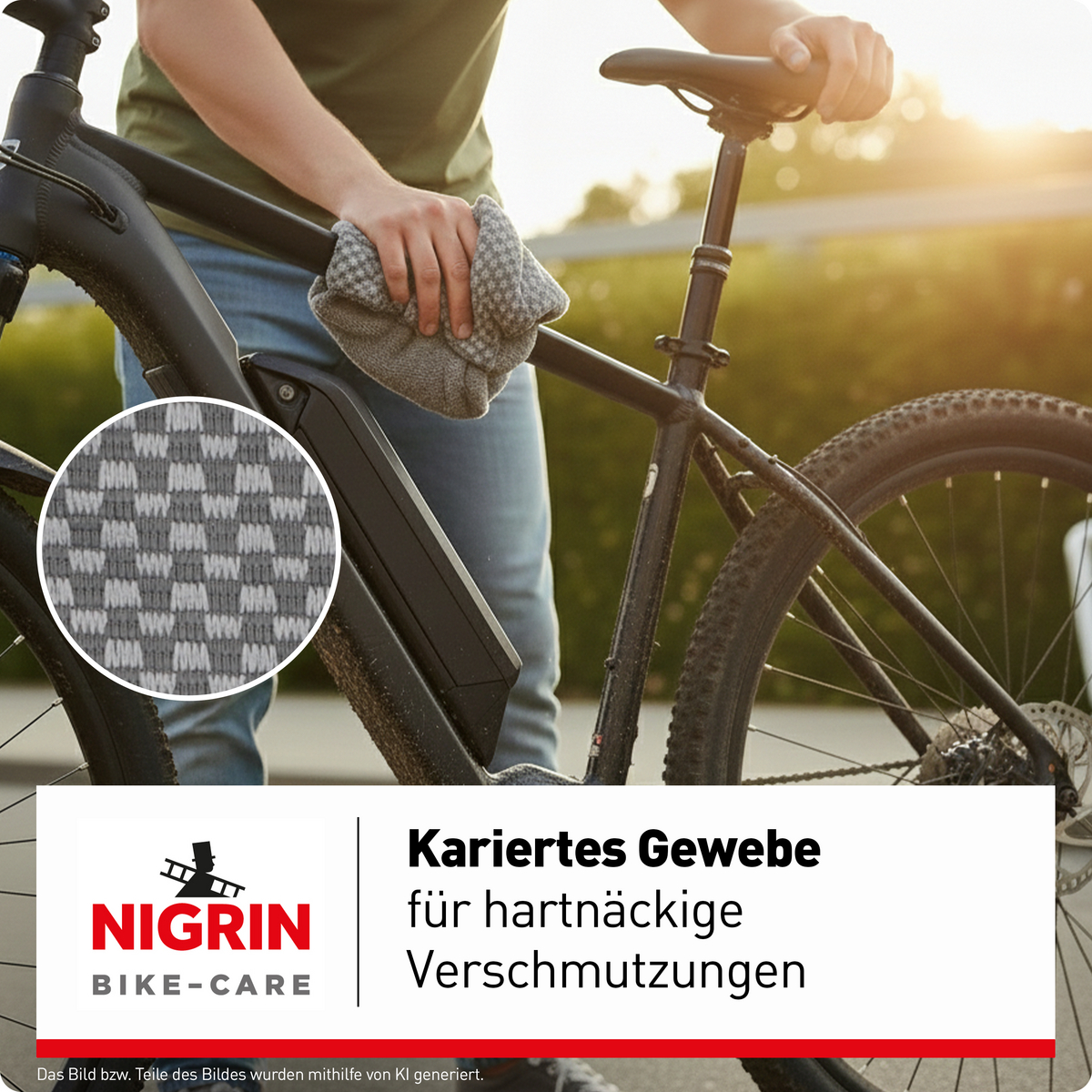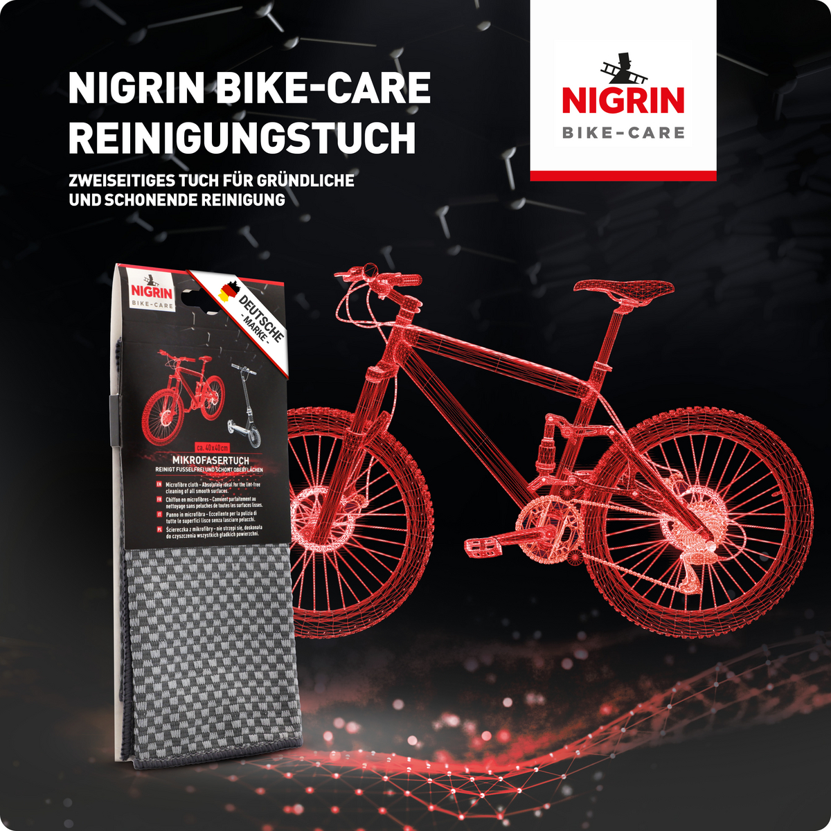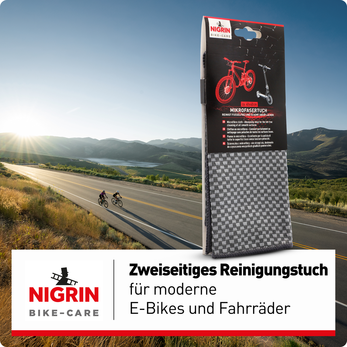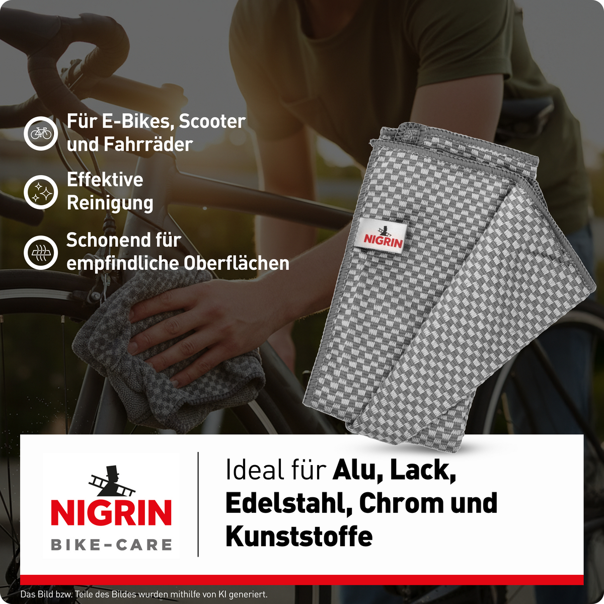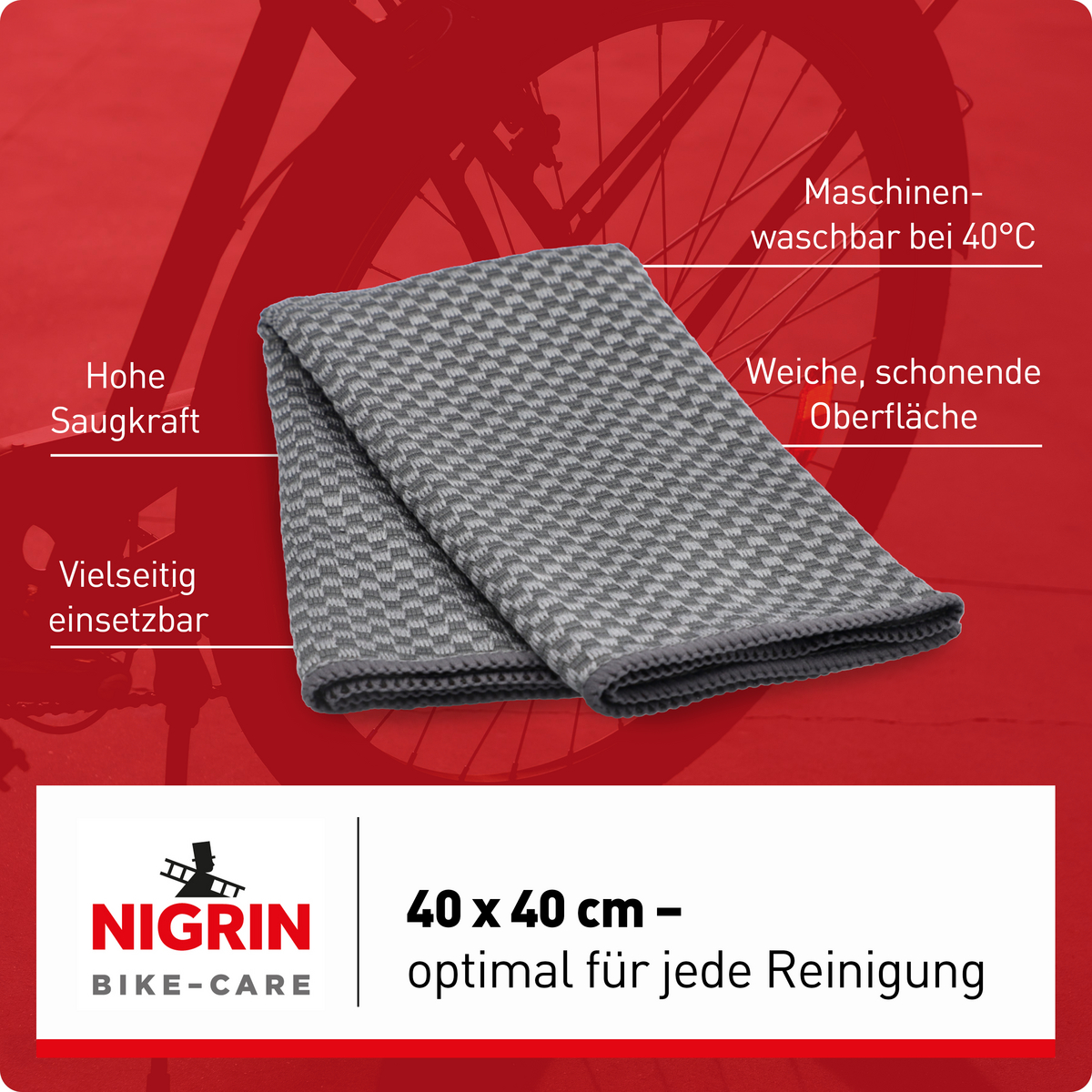 NIGRIN BIKE CARE Mikrofasertuch 2in1 mit zwei unterschiedlichen Seiten ist ideal für die Reinigung des Materialmix an modernen E-Bikes, Scootern oder Fahrrädern wie z.B. Aluminium, Lack, Edelstahl, Chrom, Kunststoffe. Es eignet sich auch bei empfindlichen Oberflächen, wobei das Tuch eine Größe von ca. 40x40 cm hat.